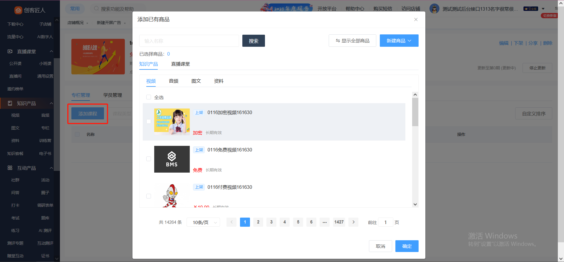 点击专栏列表操作栏的【详情】按钮,进入专栏详情页面。可以直接添加已有创建的课程,也可以选择弹窗右上角的【新建商品】,则可以新建课程。