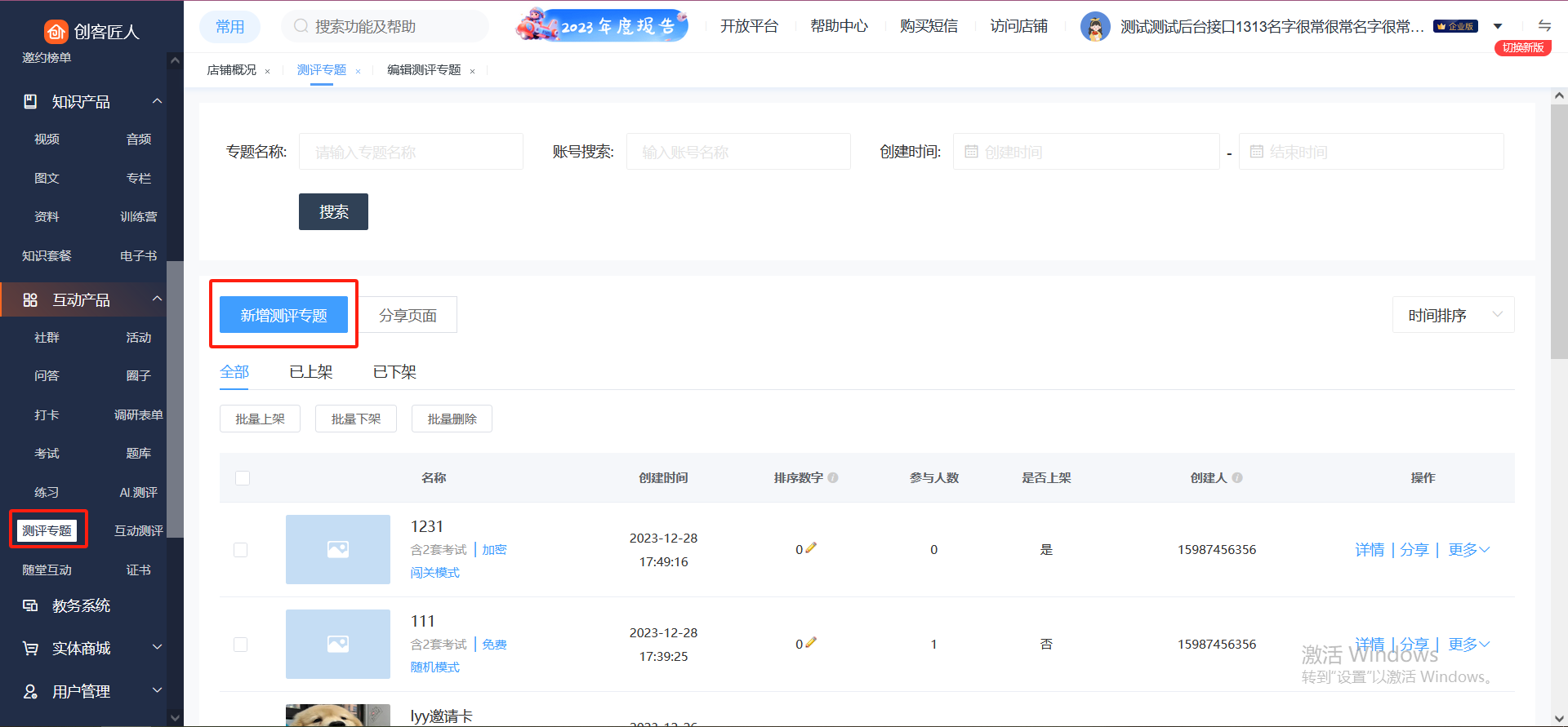1、进入测评专题页面。从后台互动产品-测评专题,点击【新增测评专题】,进入页面。
