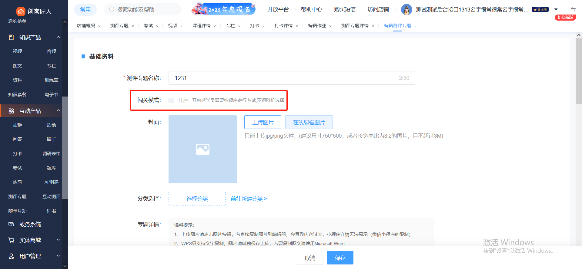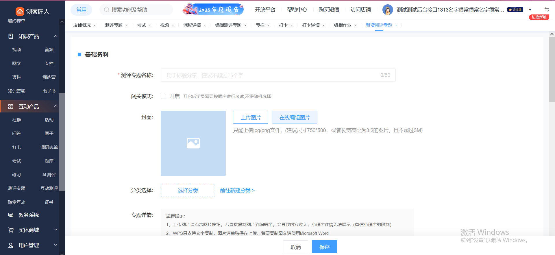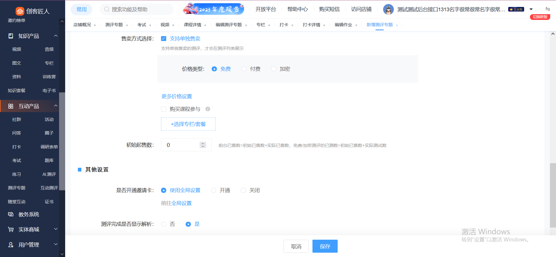 2、填写相关信息。根据需求填写测评专题的相关信息以及售卖方式,填写完后点击保存,测评则成功发布。