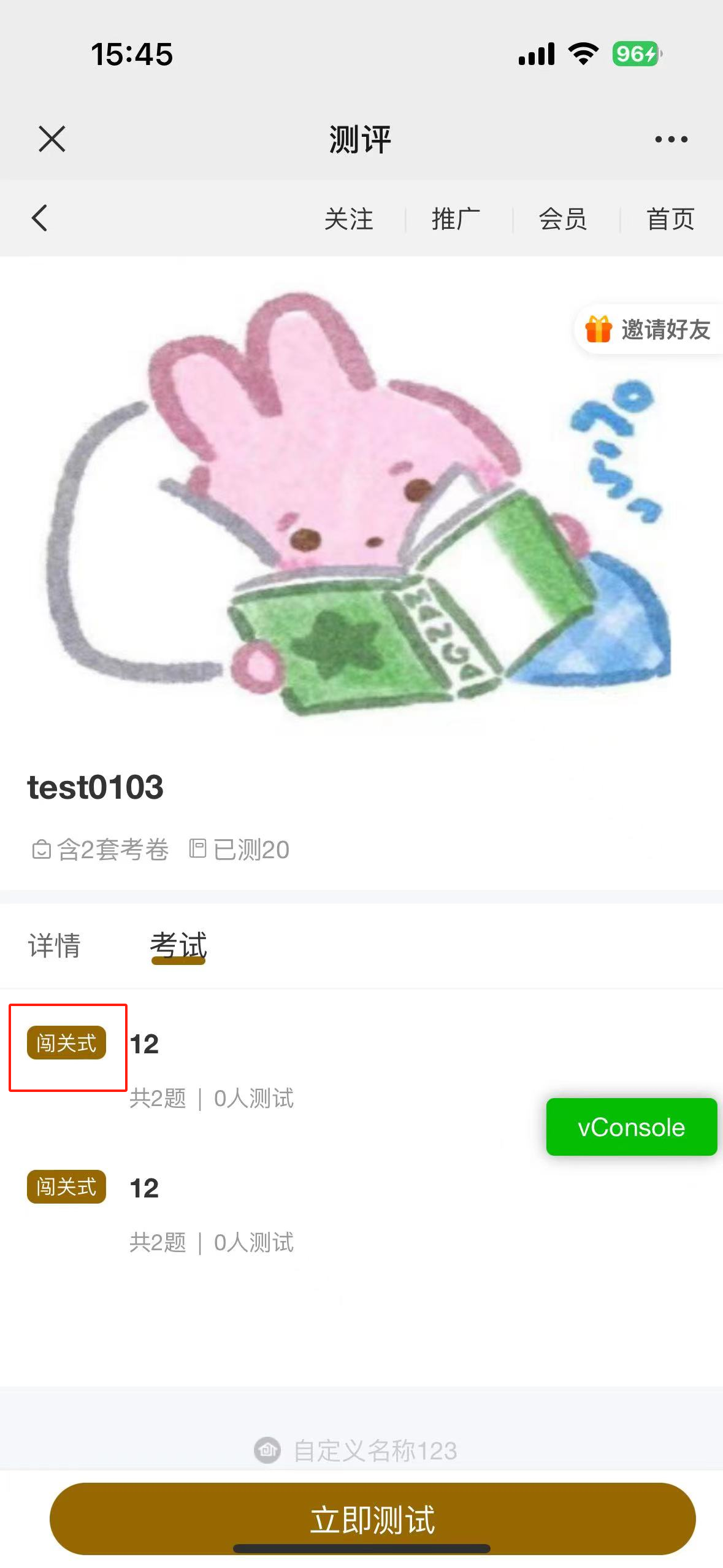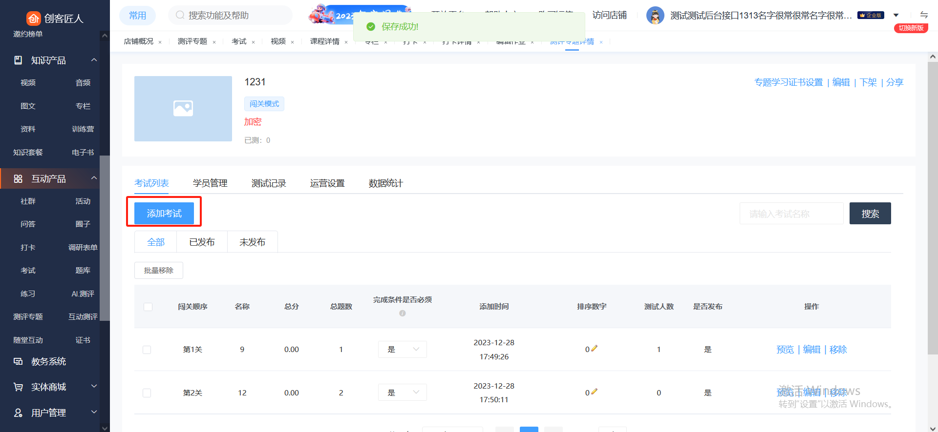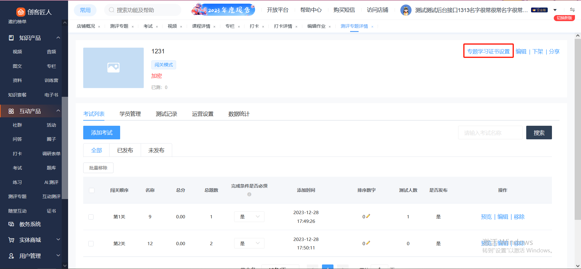 3、保存后跳转至详情页,点击【添加考试】,则可添加试卷到测评专题里,也可以查看测评的相关数据信息。