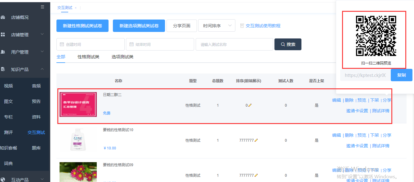 新建完成则在列表页显示,可以通过分享扫码预览试卷。