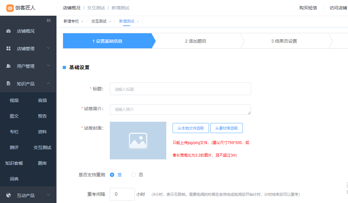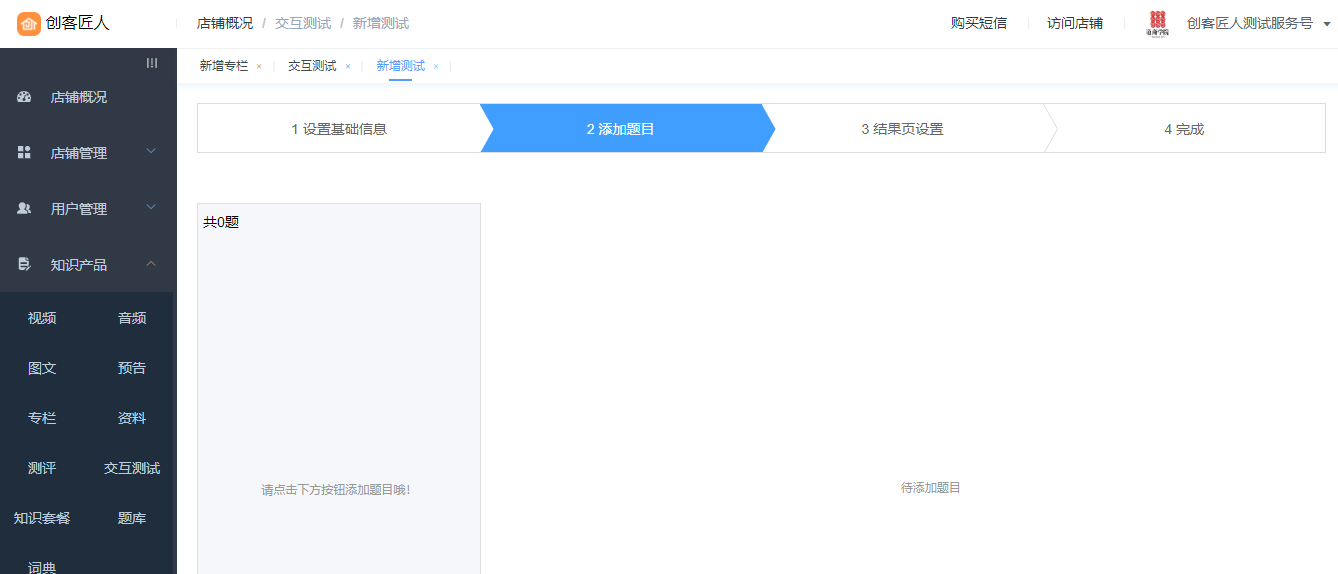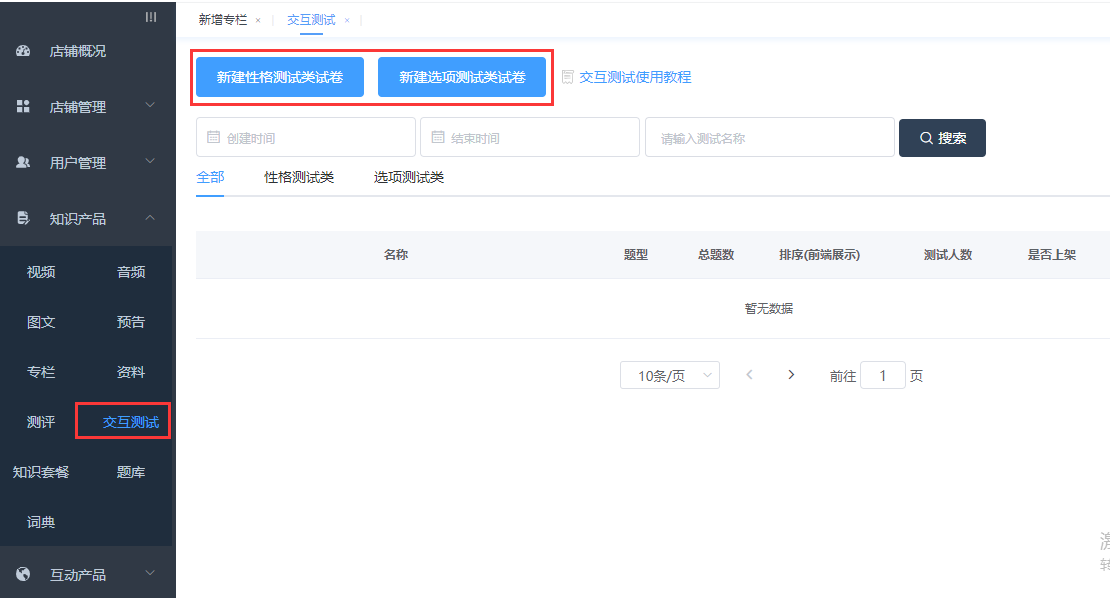 管理台进入【知识产品】-【交互测试】,进入测试列表页,选择需要新建的试卷类型。
