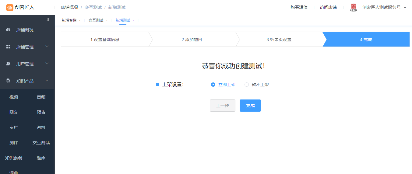 上架设置,点击完成,保存成功,则新建完成