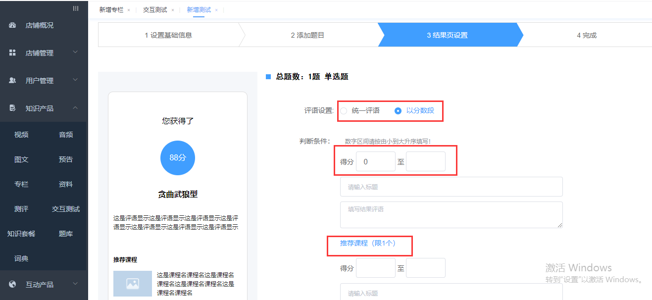 测试结果页设置,设置判断条件、测评结果、推荐课程;