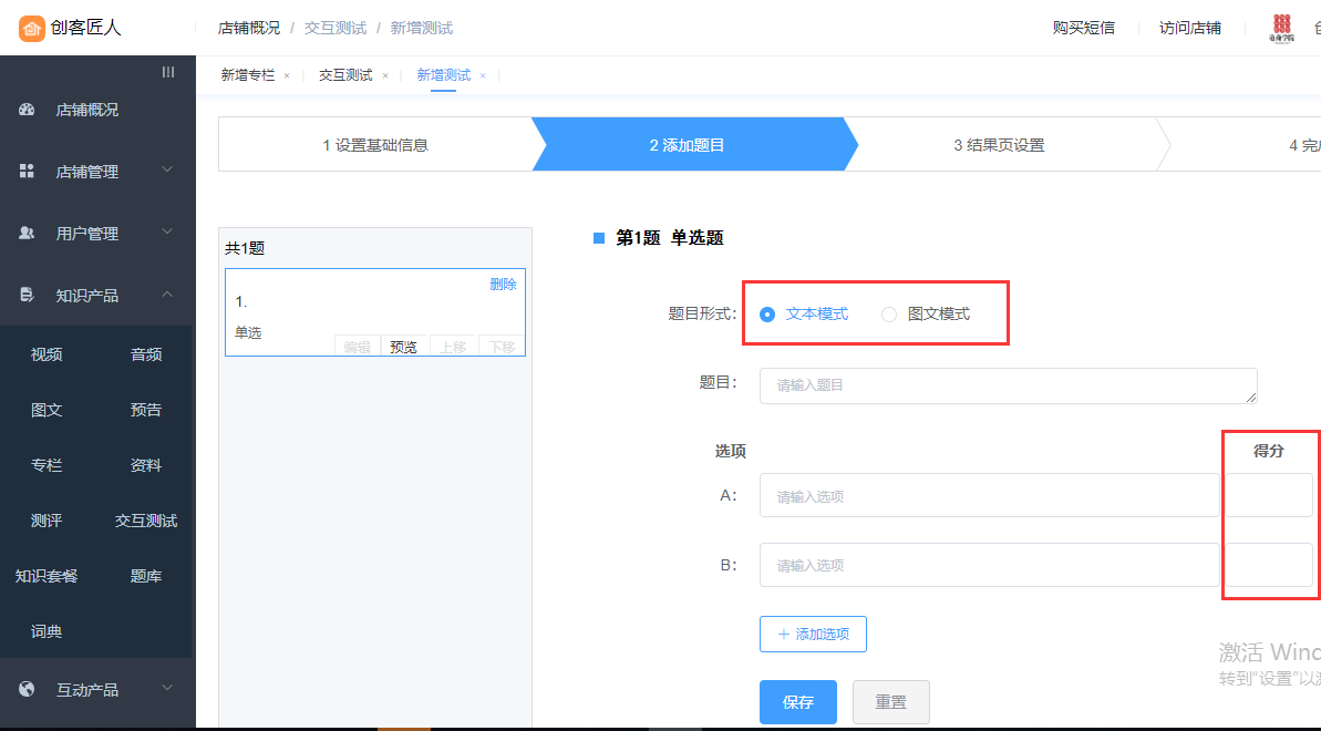 添加测试题目,题目、选项支持文本、图文模式;