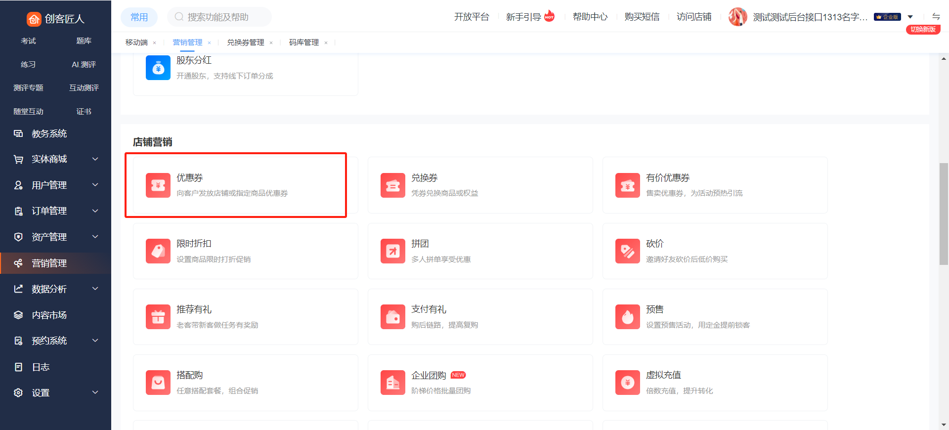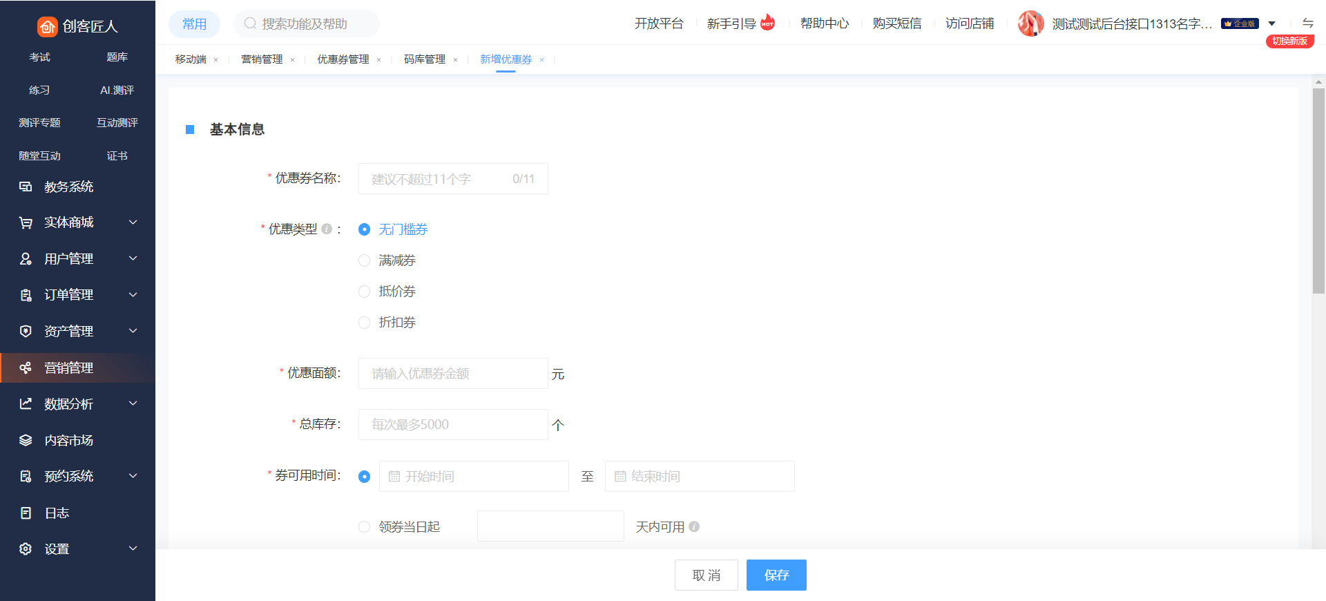 进入后台点击【营销管理】-【优惠券】进入优惠券列表,可新建优惠券,优惠券分为:无门槛券、满减券、抵价券、兑换券、折扣券。