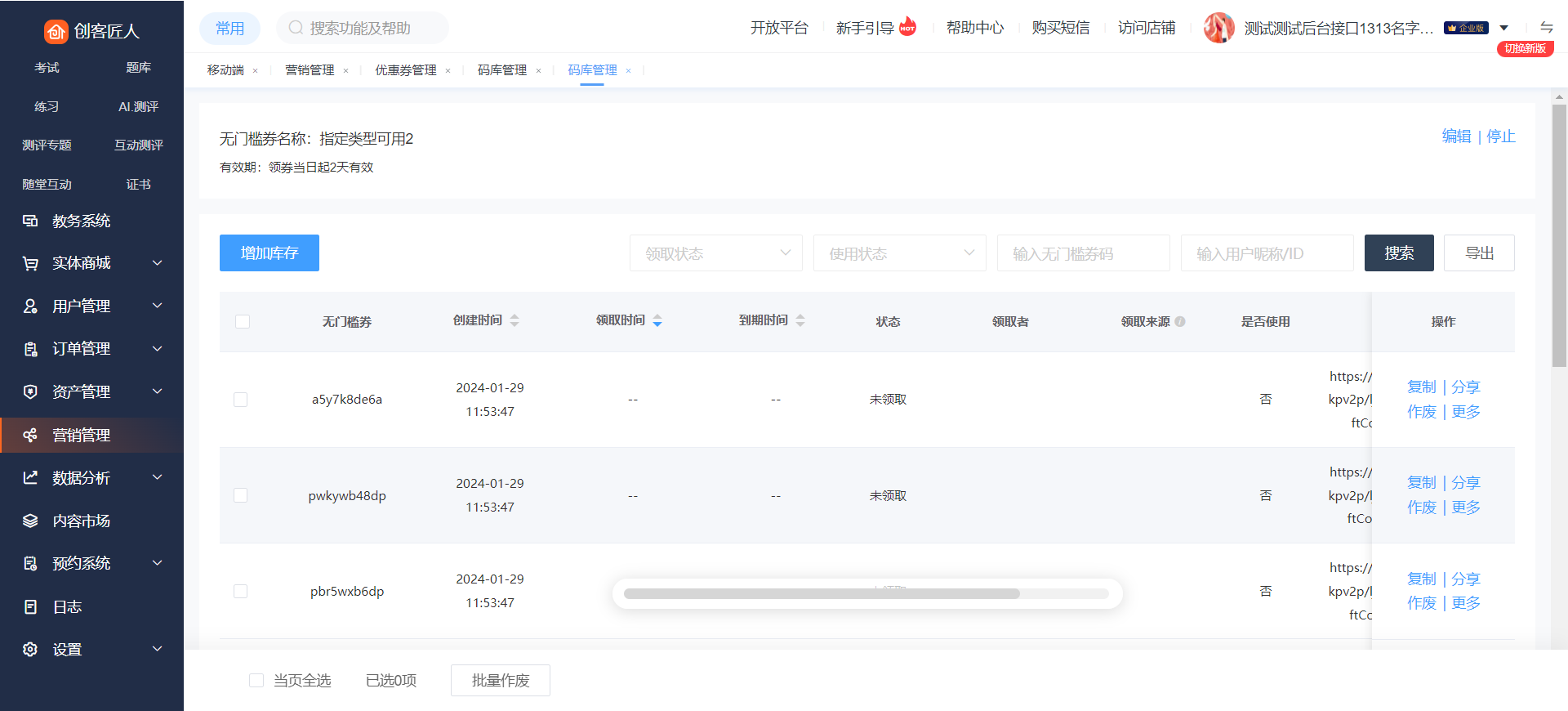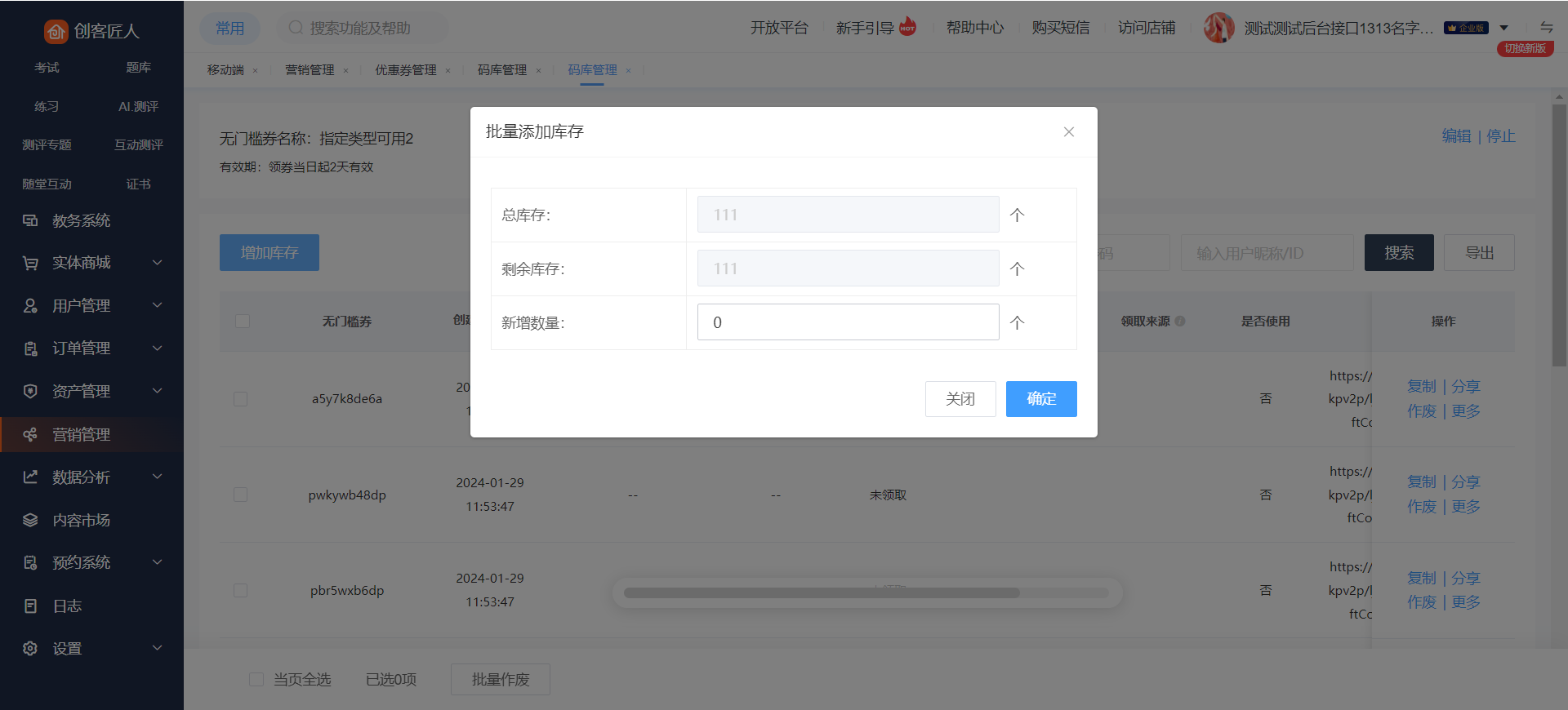 点击优惠券列表页的【码库】,可查看优惠券的兑换码的使用情况,若想增加兑换码数量,点击【添加库存】,可对库存进行追加。也可以在编辑页面的库存那增加数量,只能增加不能编辑比之前小的库存数字。