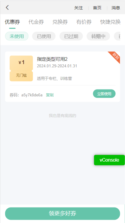 用户通过店铺首页点击【我的】进入个人主页,点击【优惠券】进去优惠券领取列表,也可以切换到兑换券,查看兑换的记录,点击可以查看具体兑换商品,可在底部兑换入口输入兑换码兑换。