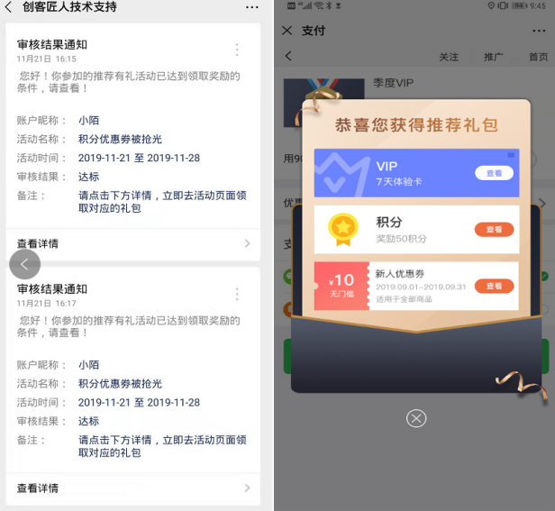 场景二:某知识店铺想要提高用户转化率发起了一场推荐3人支付送优惠礼包,推荐10人支付送月vip体验卡的活动,通过不同等级来激励推荐者去拉新转化,
