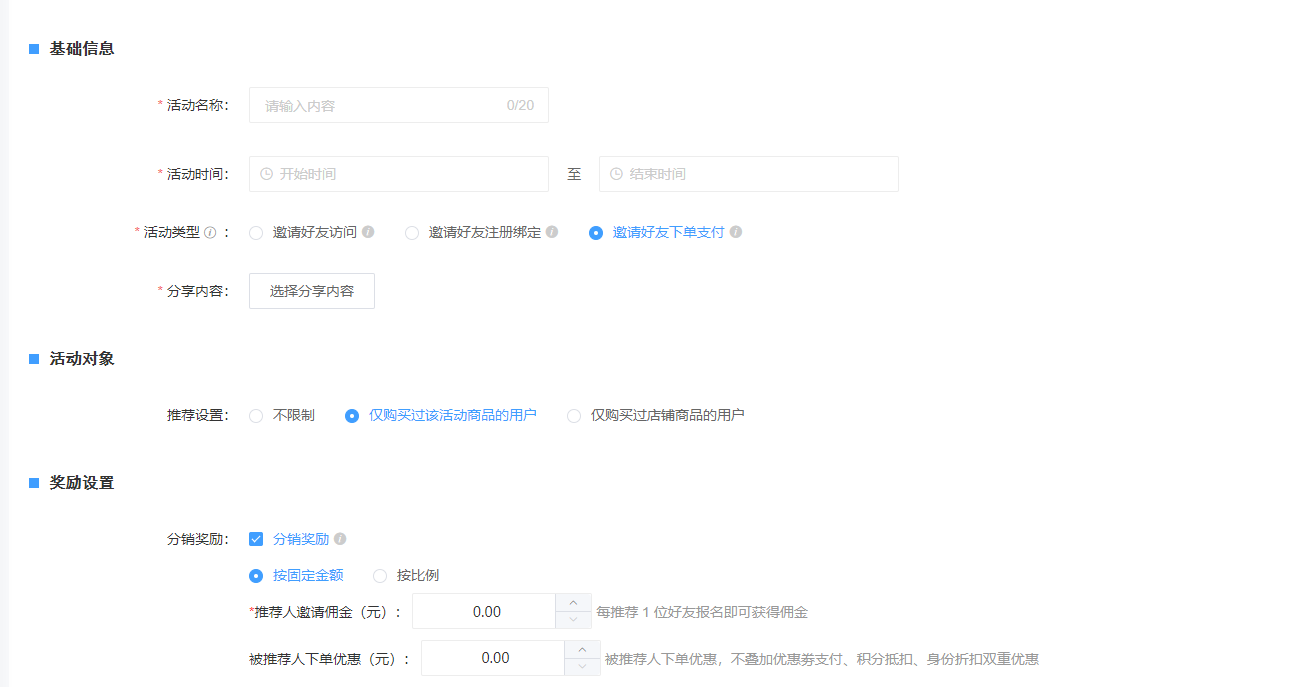 邀请好友下单支付的类型,可设置活动对象,可支持购买过该商品的用户参与,可设置分销奖励,设置分销奖励后,则该商品就不再执行系统分成,谁推广,谁拿佣金的逻辑,佣金可按该订单的固定金额或固定比例来发放,按估计比例时,可叠加会员折扣,比如该商品100元,会员8折,如果不开启叠加会员,则即使推荐会员购买,会员也是按100元购买;如果叠加会员,则可在100*0.8=80元来购买