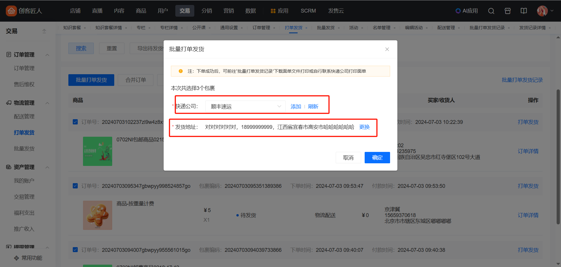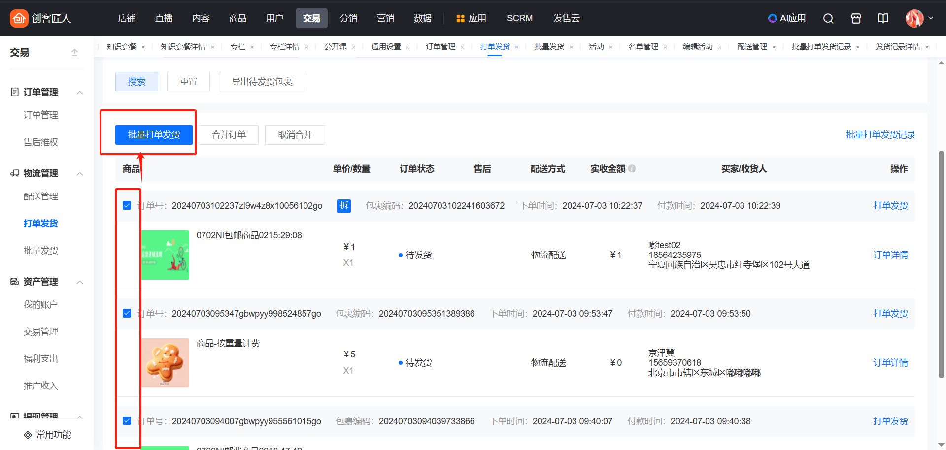 需要批量打单发货的话,左侧勾选完成后,点击“批量打单”