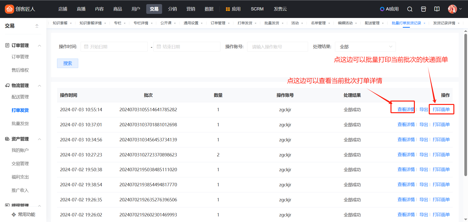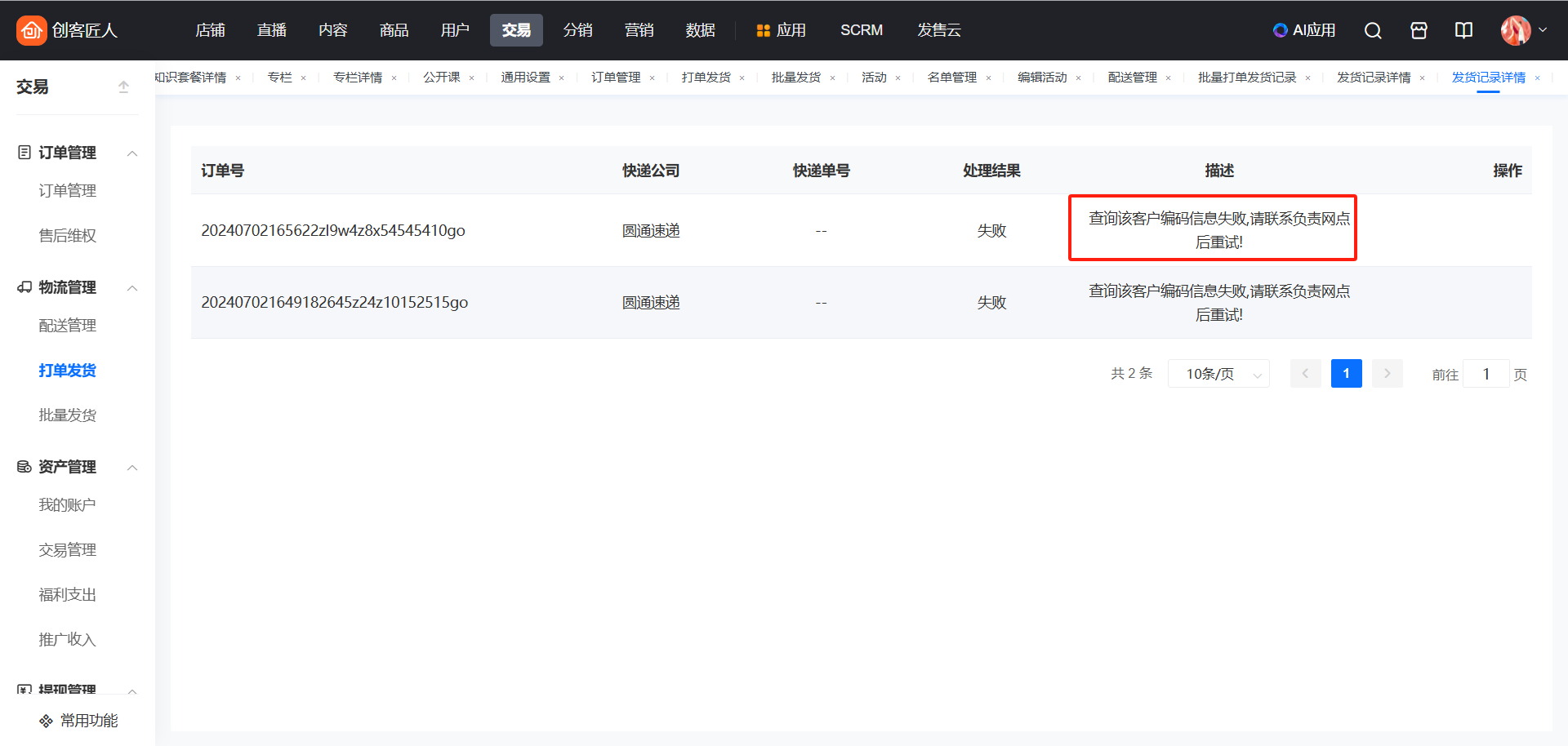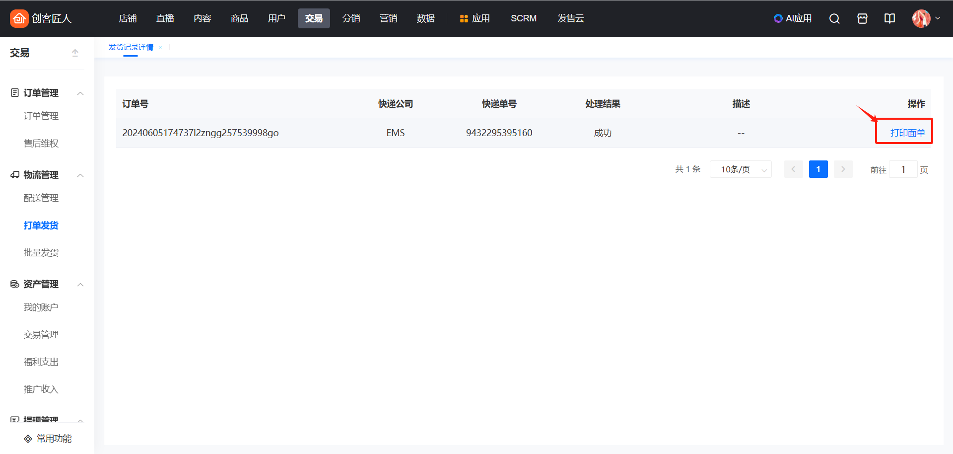 点击确定后,系统就会把这些包裹信息发送给对应的快递公司,等快递公司那边返回快递单号之后,就可以去“打单记录”页面查看发货成功没有,如果成功了,就可以点击“打印面单”按钮,进行面单打印。如果打单失败,可以查看下失败的原因。根据原因进行调整。