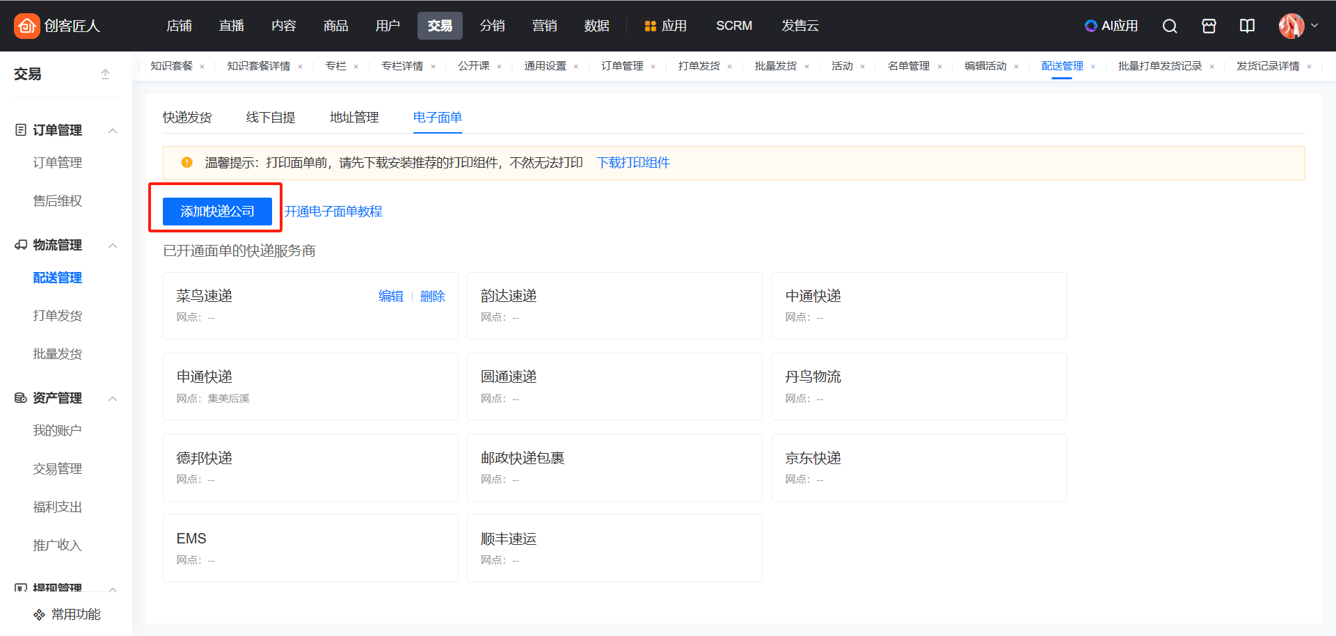 点击添加快递公司按钮,把已开通的结算账号、网点编码等信息填进去