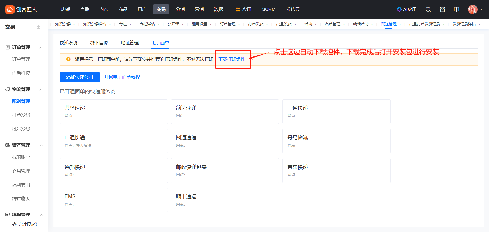 第四步:下载面单打印控件,只有在电脑上安装了打印控件,才能正常打印出面单