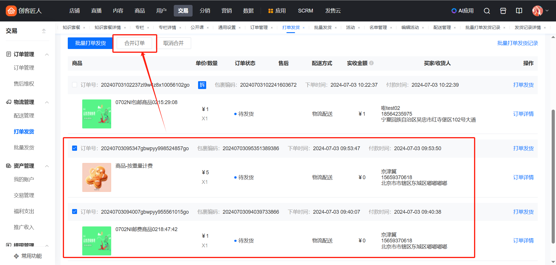 如果同一个用户,使用同一个收货地址在店里里面下了多单。为了节约快递成本,也可以把这些订单合并成一个包裹发货。在包裹列表找到这些订单对应的包裹,勾选。然后点击合并打单。就能把这些订单的包裹合并成一个新的包裹一起发货了。