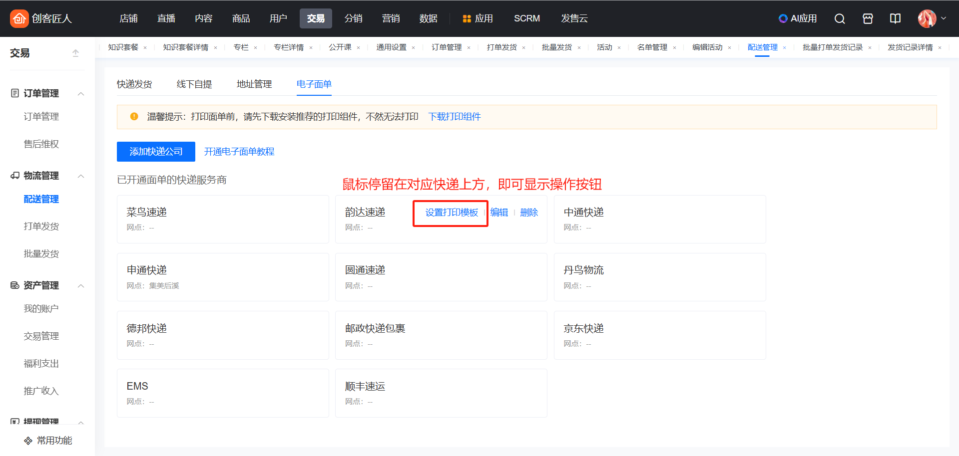 快递公司添加完成后,可以鼠标停留在该快递卡片上方,进行快递面单模板设置,面单支持设置一联和二联的