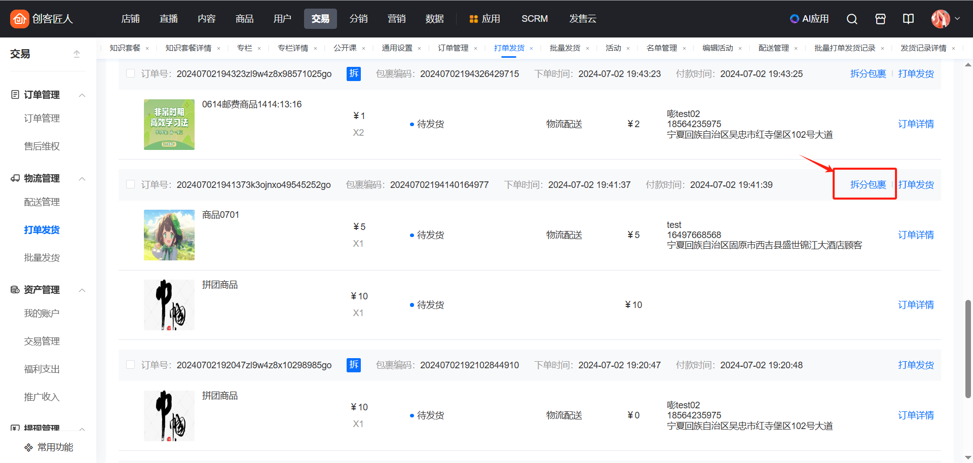 如果一个订单的待发货商品比较多想要拆分成多个包裹发货,可以在包裹右侧点击“拆分包裹”