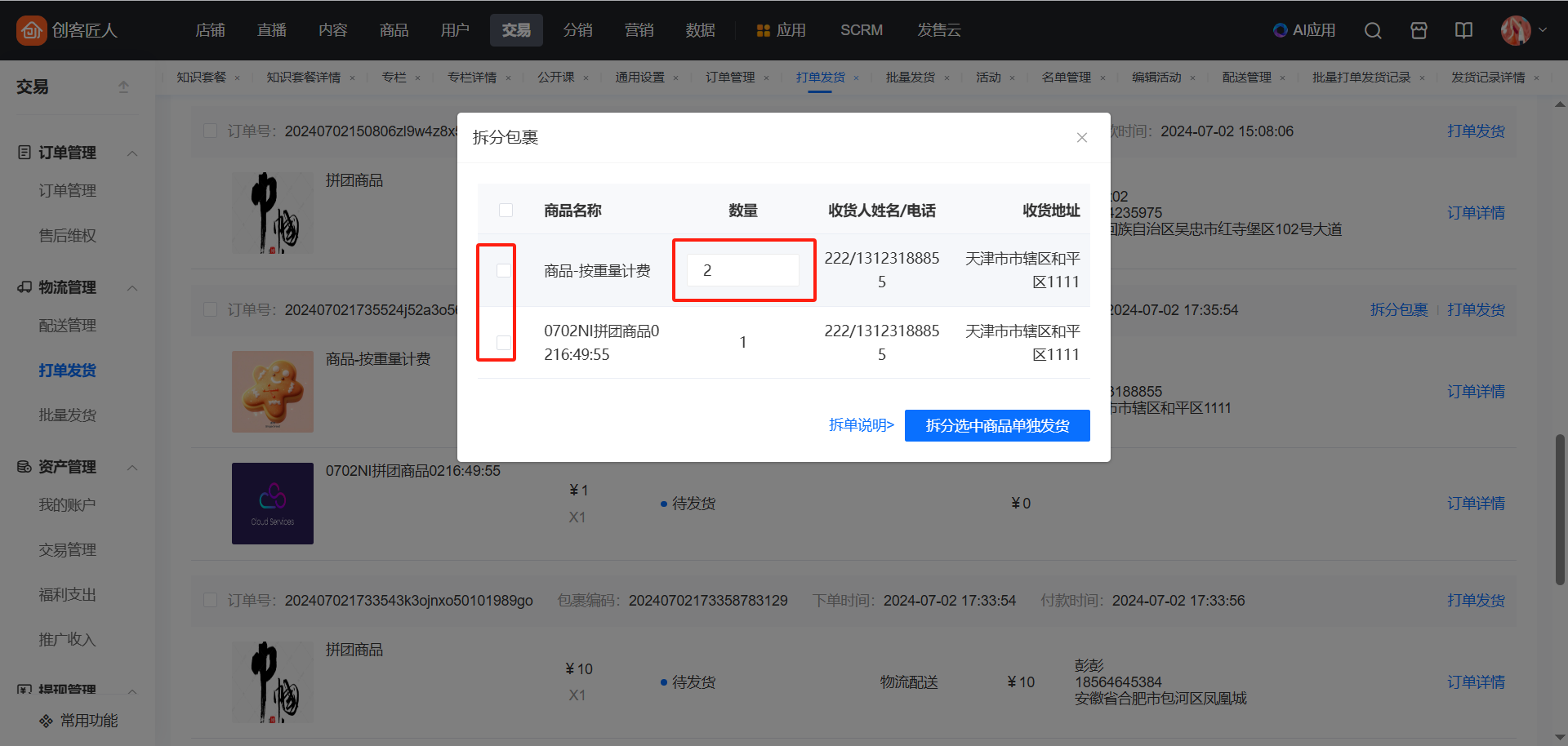 点击左侧的复选框,选择需要拆分出去作为新的包裹的商品,一个商品如果客户下单了多件的,也可选择要拆分出去的数量。设置完成后,点击下方的“拆分选中商品单独发货”按钮,就会把已选择的商品和数量单独生成一个新的包裹。