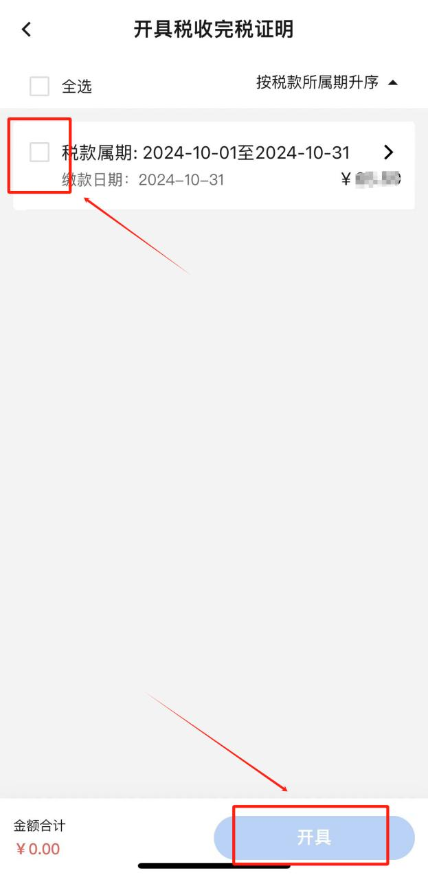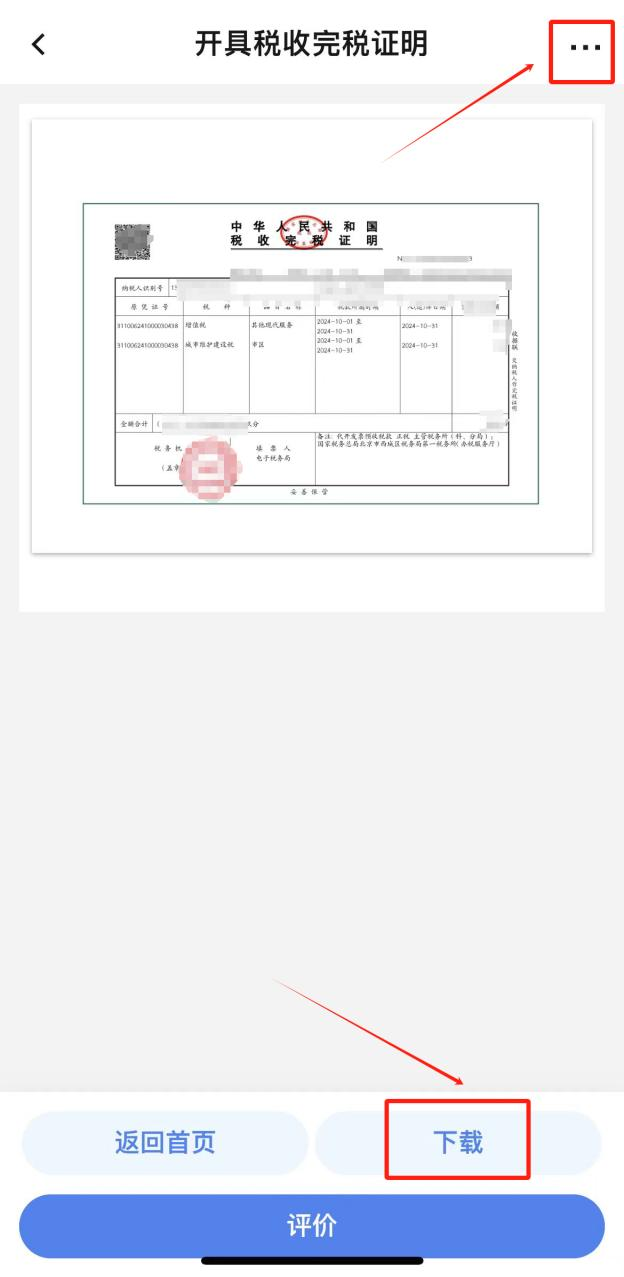 在查询结果中勾选本次缴纳的单笔税款,点击“开具”,即可查看并下载完税证明(如有需要,您可点击完税证明预览页面右上角“...”将发票分享至对方)。