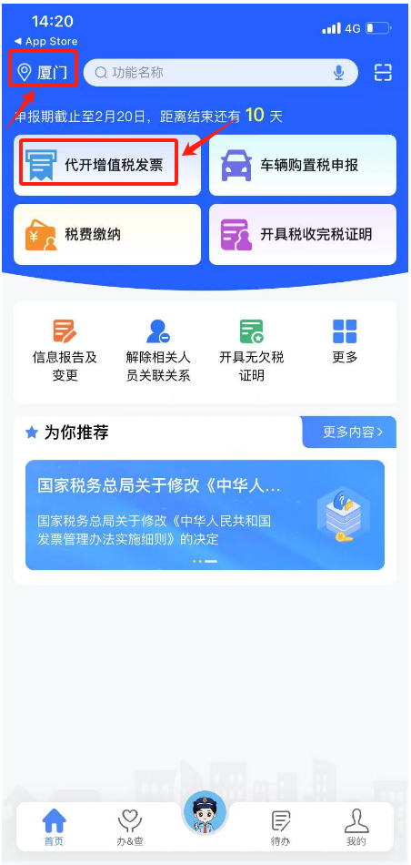 首页左上角定位选择用户所在地区,比如“厦门”,点击首页“代开增值税发票”,根据系统提示完成人脸识别。