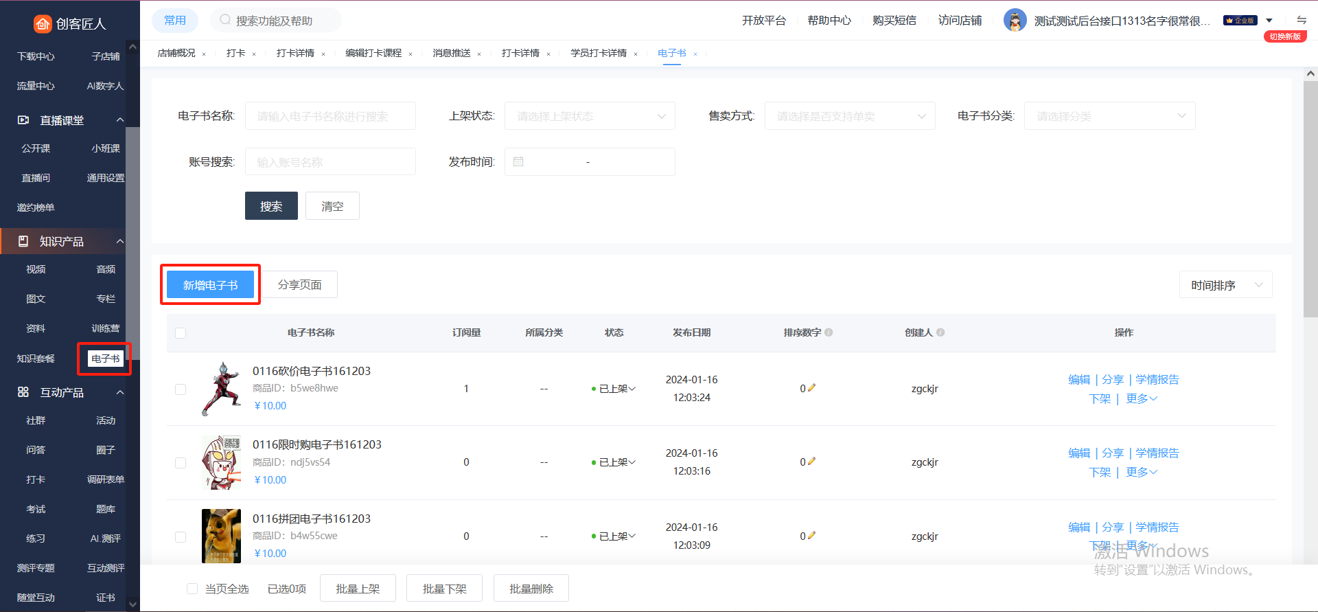 1.登录创客匠人管理后台,从【知识产品】选择【电子书】→【新建电子书】