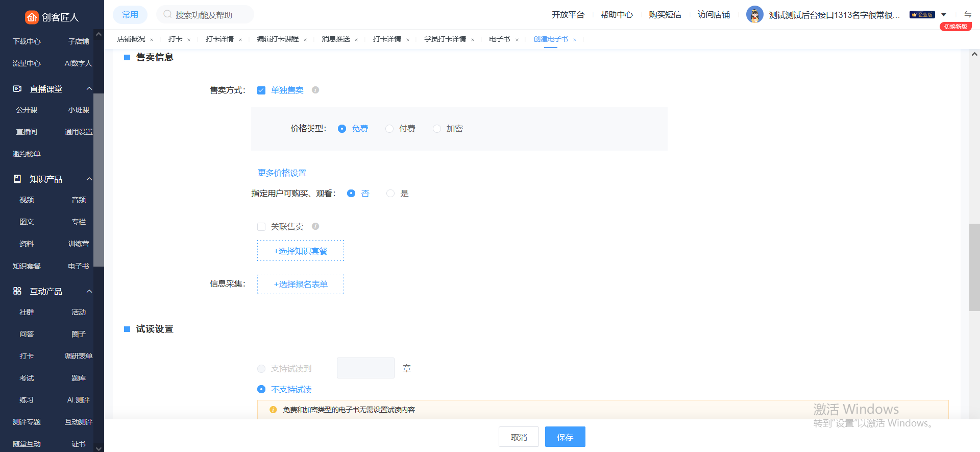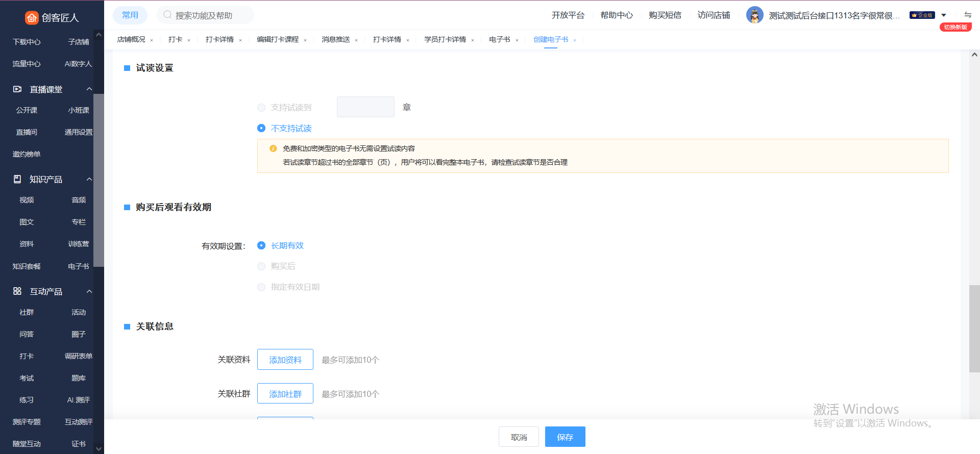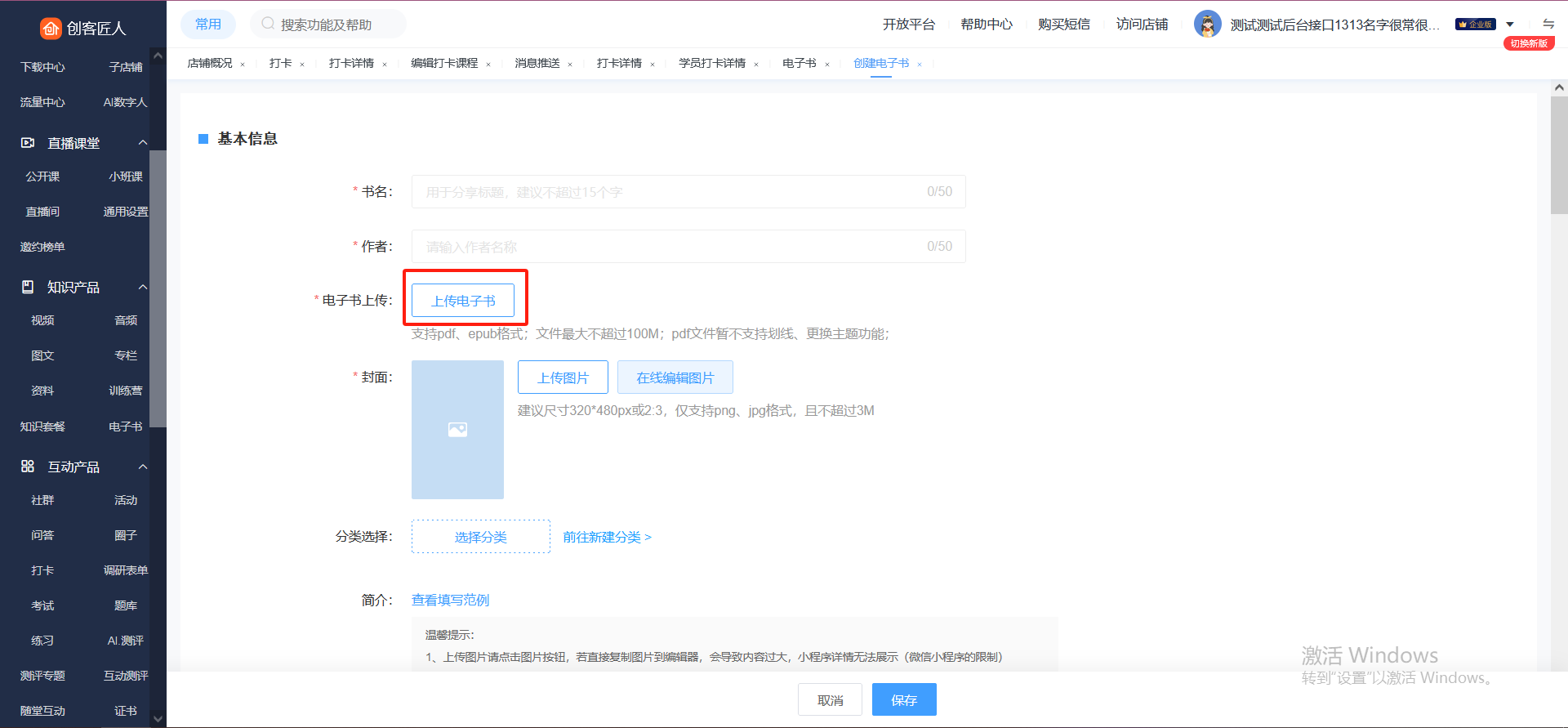 商家端:商家后台 →知识产品 → 电子书 → 新建电子书