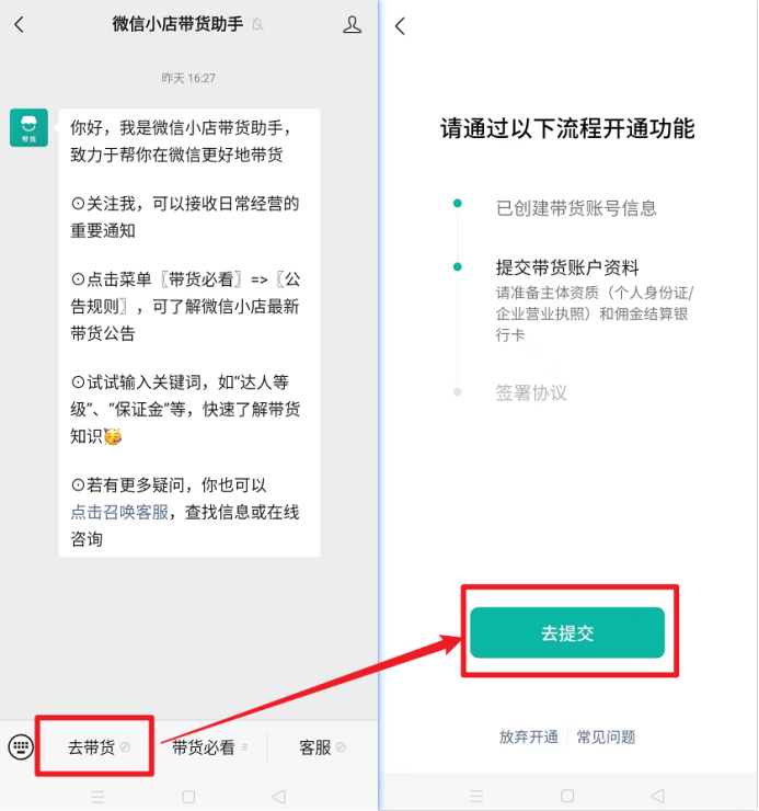 点击左下角菜单栏“去带货”,进入开通页面,点击“去提交”。
