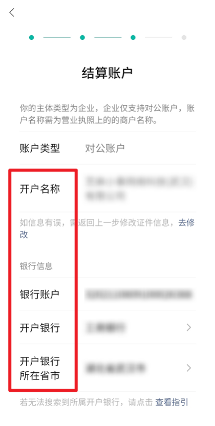选择对公账户,填写开户名称、对公银行账号、开户银行、开户银行所在省市。