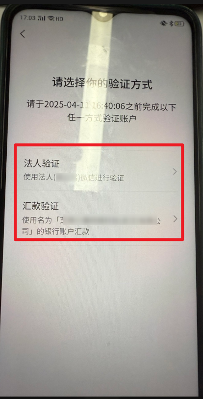 使用法人微信验证或者汇款验证,一般一个工作日审核。