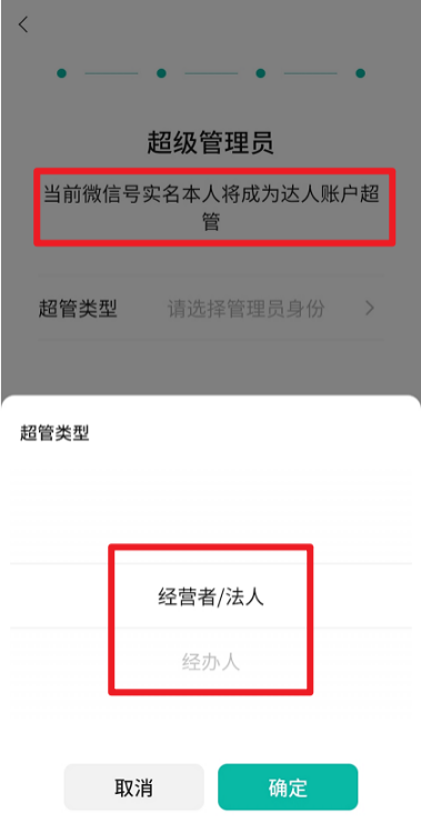 超级管理员身份证件: 超级管理员为达人账号和微信支付账户的管理者,可以为法定代表人本人,也可以为被授权的其他员工,仅支持大陆身份证件。