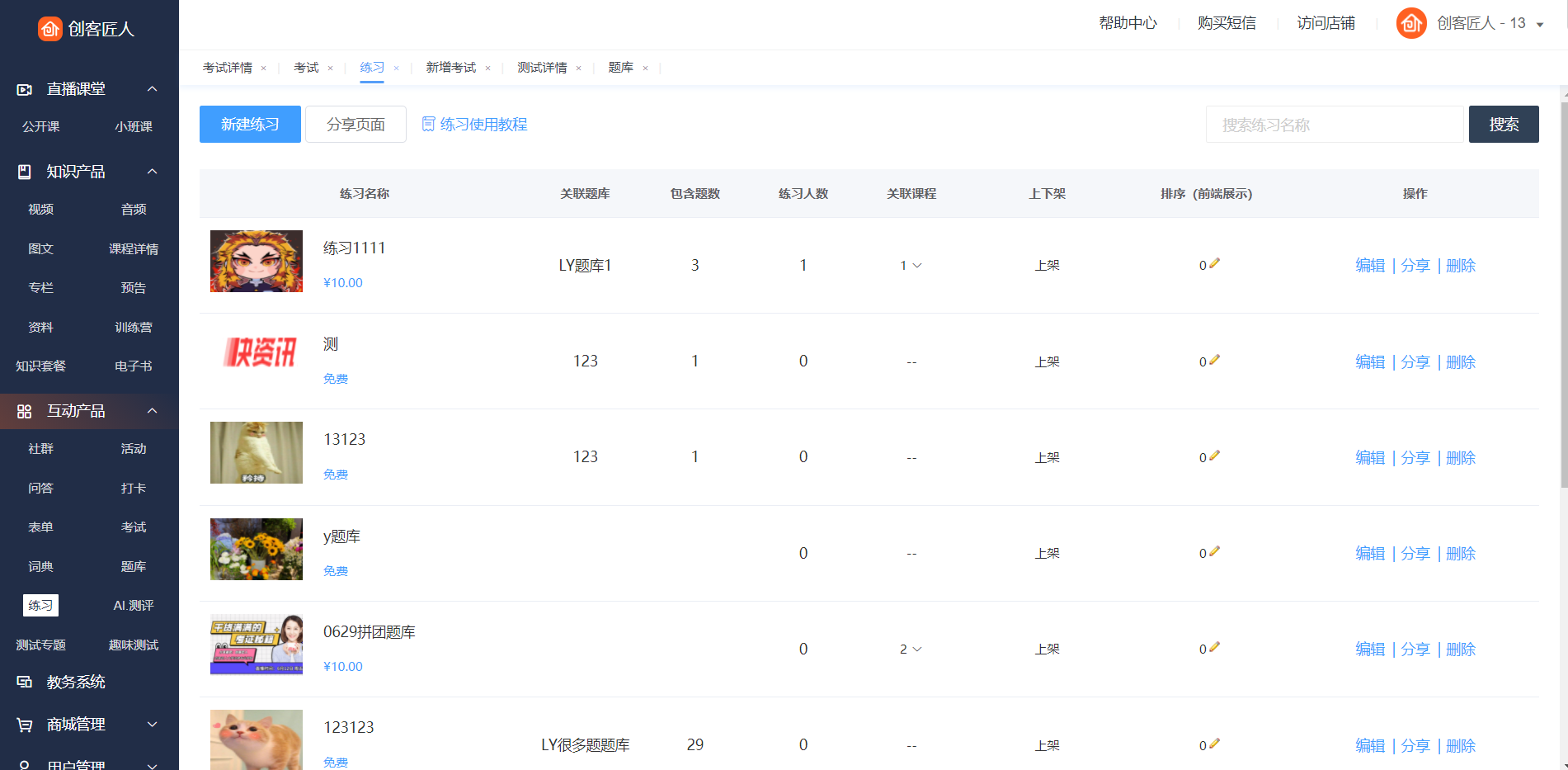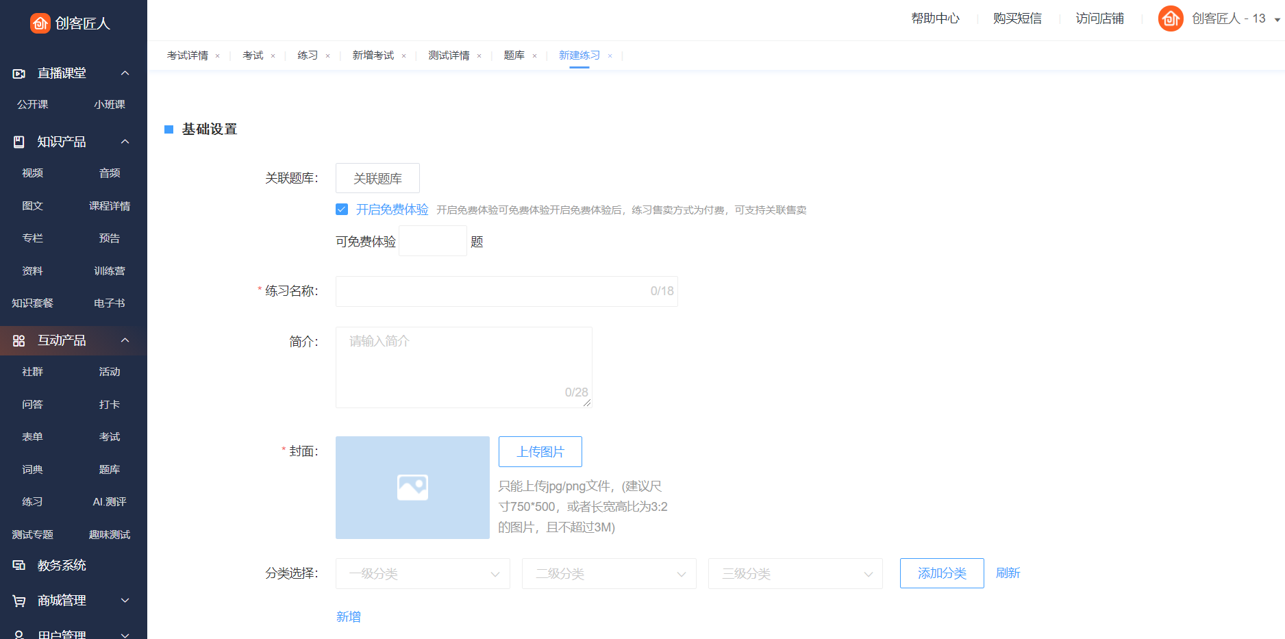 教师端(商家后台):管理后台→互动产品→练习→新建