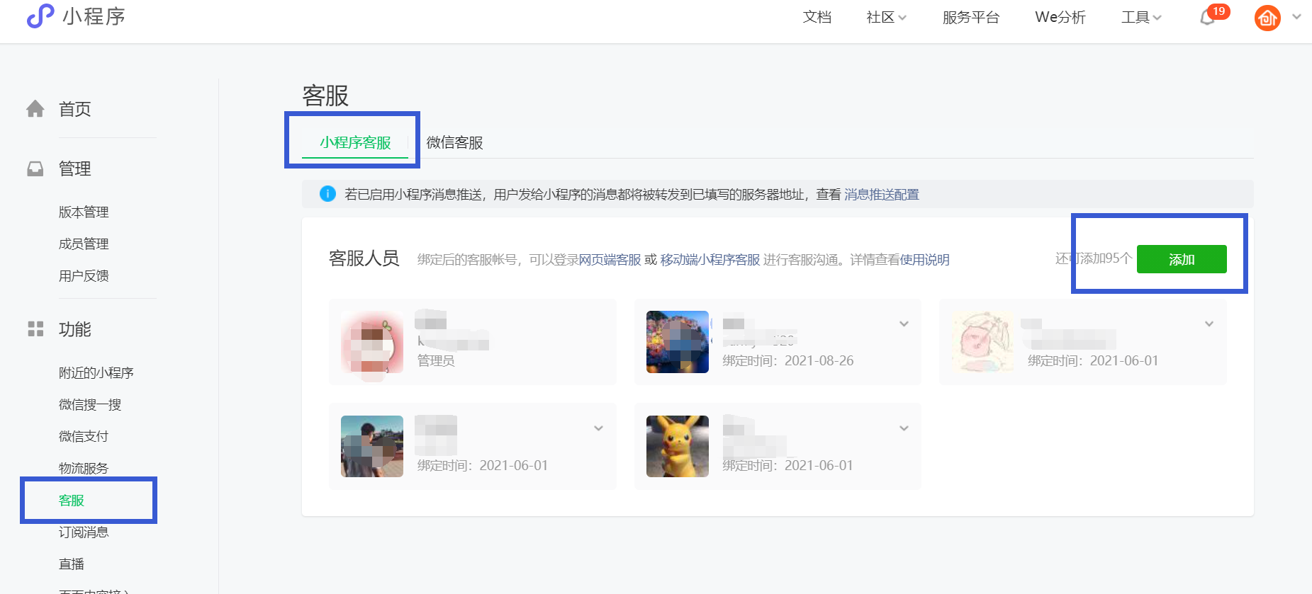 第一步、进入【微信小程序后台】,点击“功能”-“客服”进入【客服页面】添加客服人员。