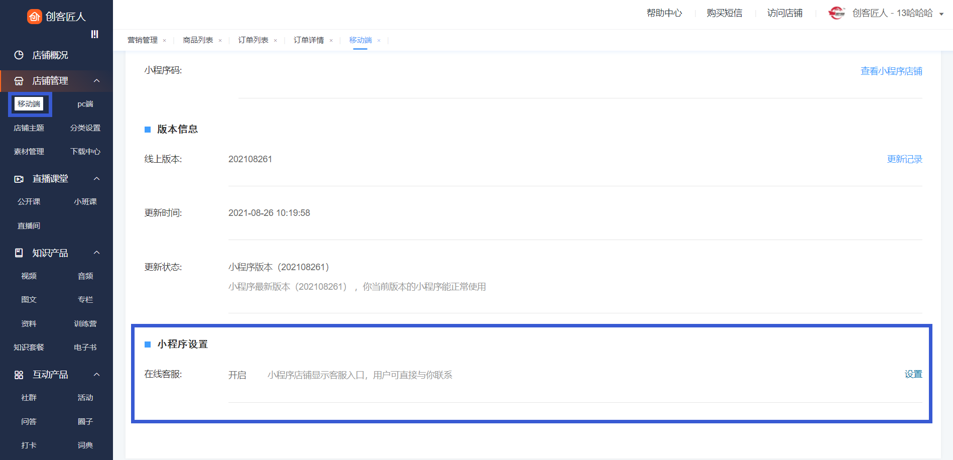 创客匠人微信小程序支持接入微信官方客服消息功能。商家在店铺管理---移动端---小程序---设置里开启“在线客服”功能后,用户可通过小程序客服入口与商家进行沟通,商家可以登录微信网页端客服或移动端小程序客服跟用户进行客服沟通。商家客服入口可选择配置在“店铺首页”、“课程详情页”、实体商城页。