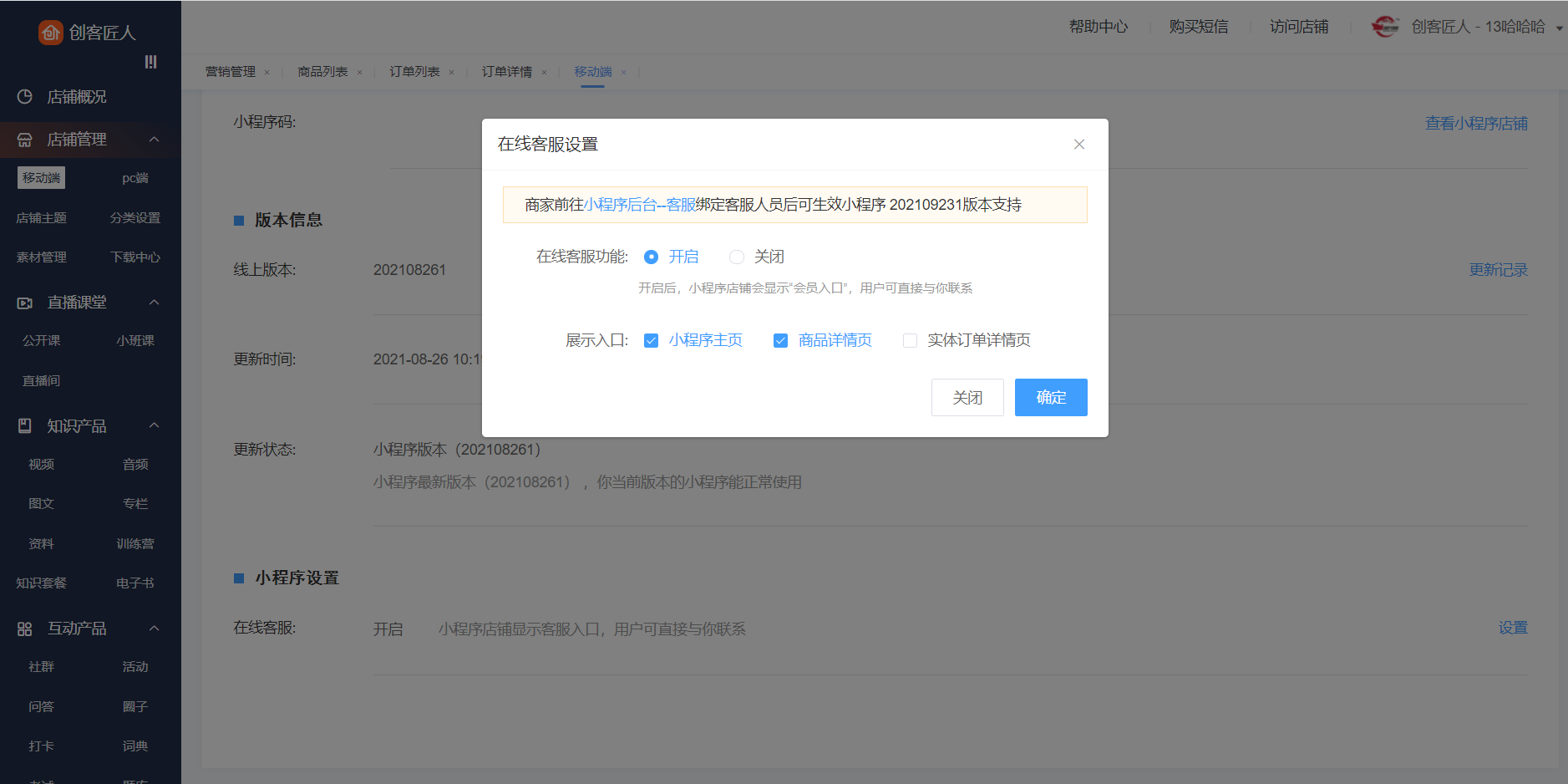 第二步、进入客户后台【店铺管理-移动端-小程序-微信小程序设置】,开启“在线客服“功能并设置C端客服入口展示位置。(注意:开启“在线客服“功能前一定要在【微信小程序后台】配置客服人员,否则无法接收到用户消息)