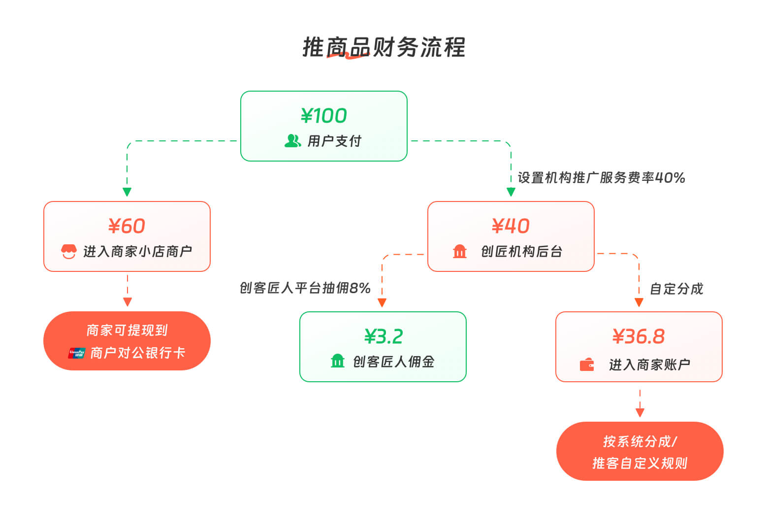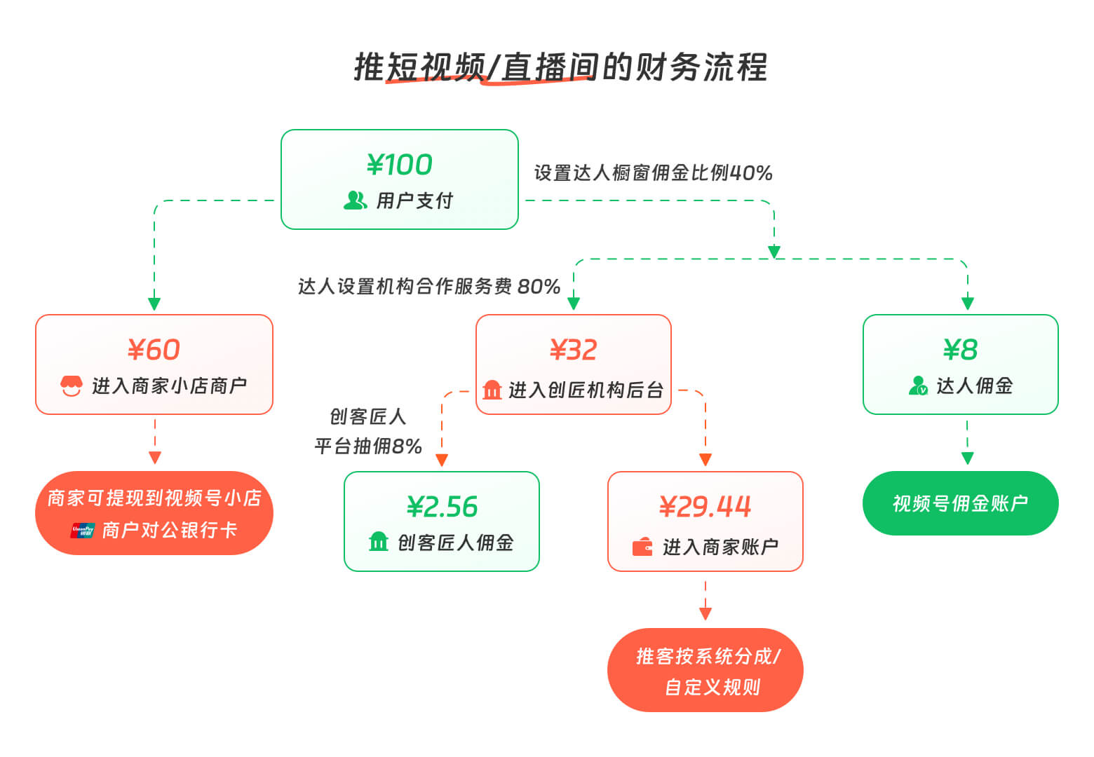 举例:某商家在微信小店后台--达人推广---定向/专属/普通商品服务费为40%,达人设置“内容合作计划”,服务费比例80%。