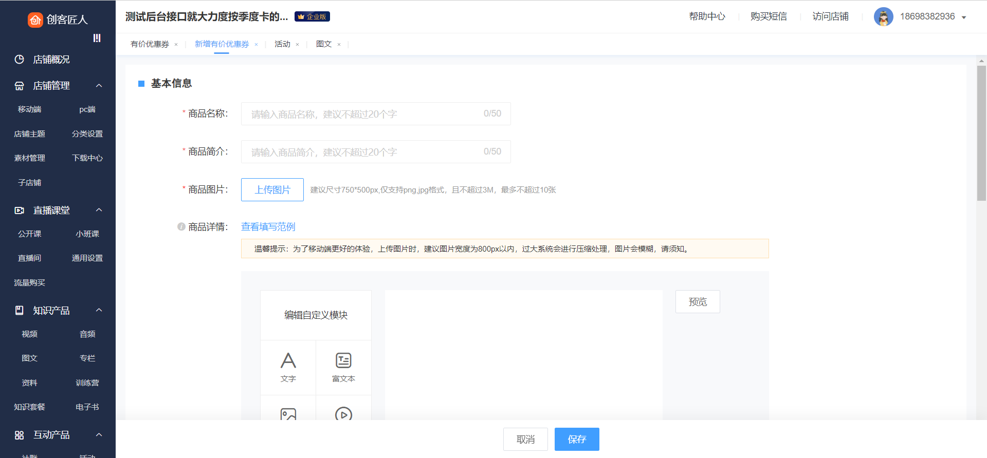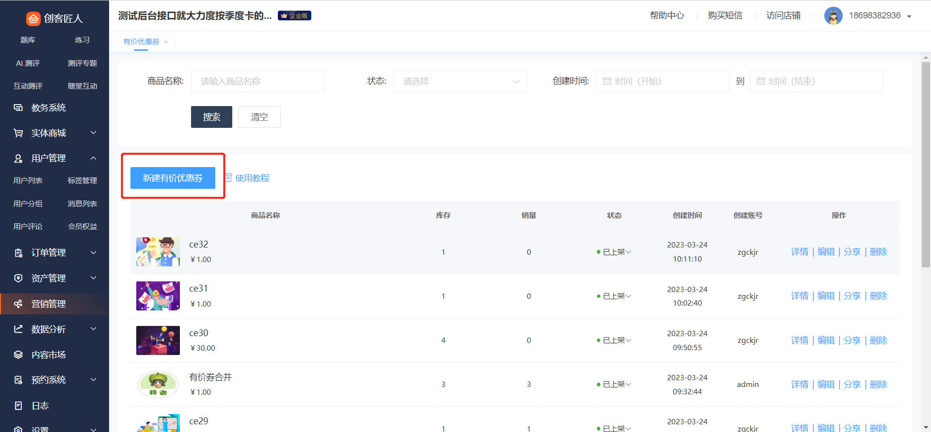 进入后台,点击【营销管理】--【有价优惠券】模块,进入有价优惠券列表,点击【新建有价优惠券】按钮,进入创建页