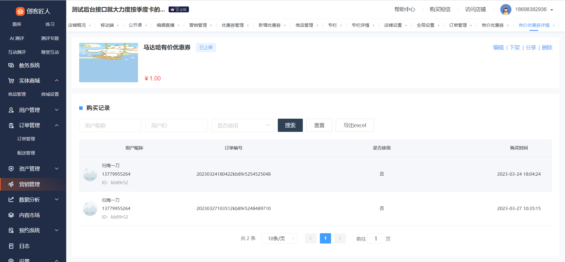 可在有价优惠券创建后查看详情,查看已购买的用户记录;若退款或取消购买后,购买记录中则不显示该订单;券已使用不支持退款