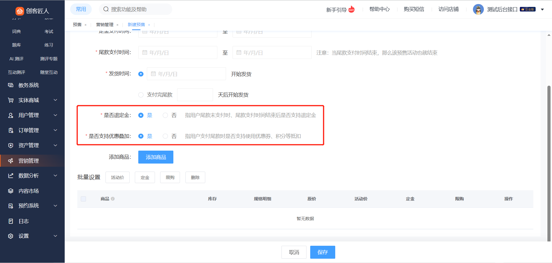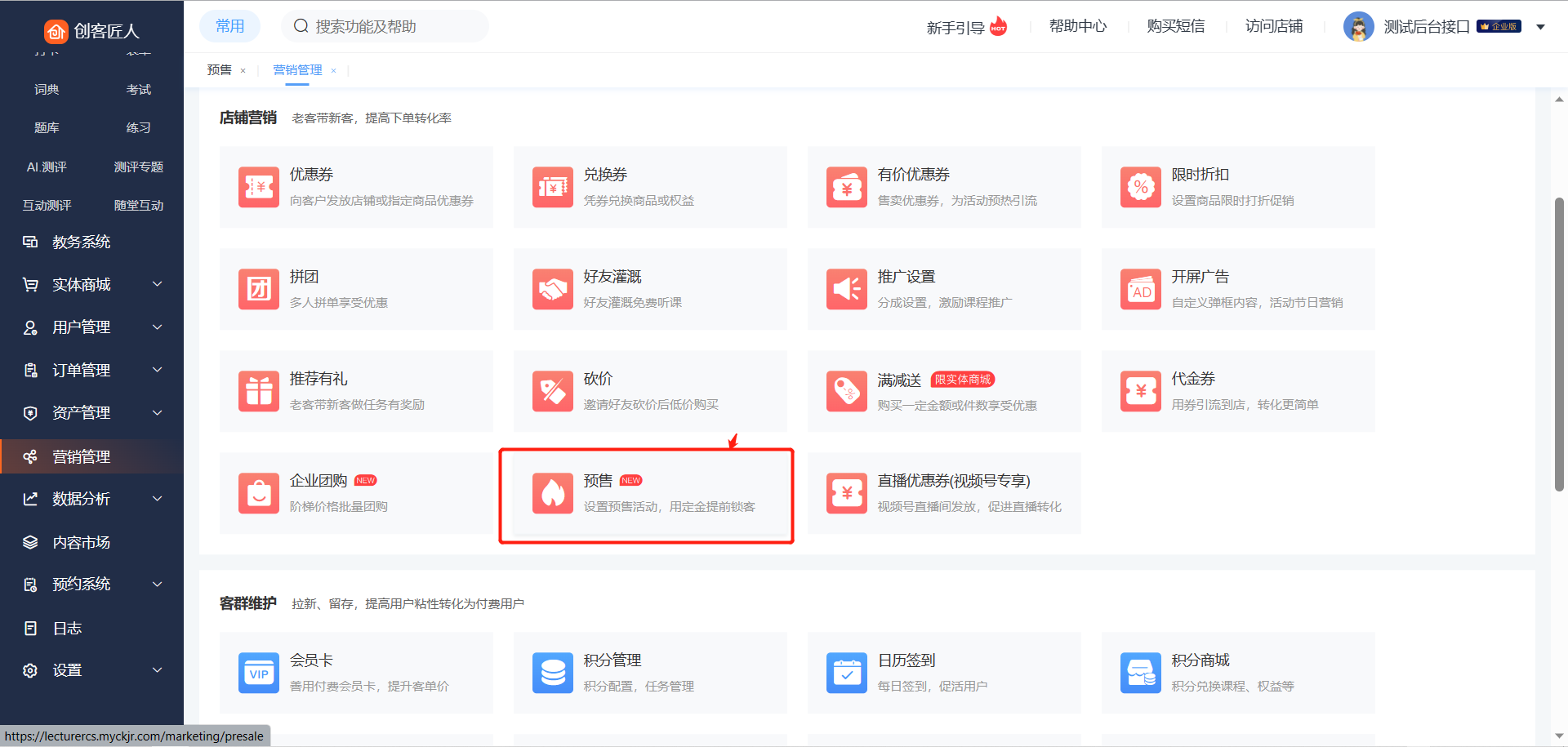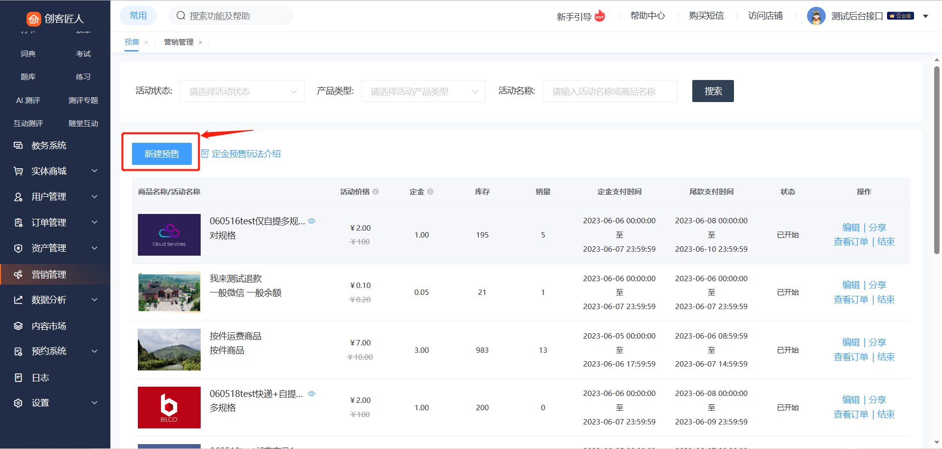 第一步:在营销管理找到预售入口,点击“新建预售”创建一个新的预售活动