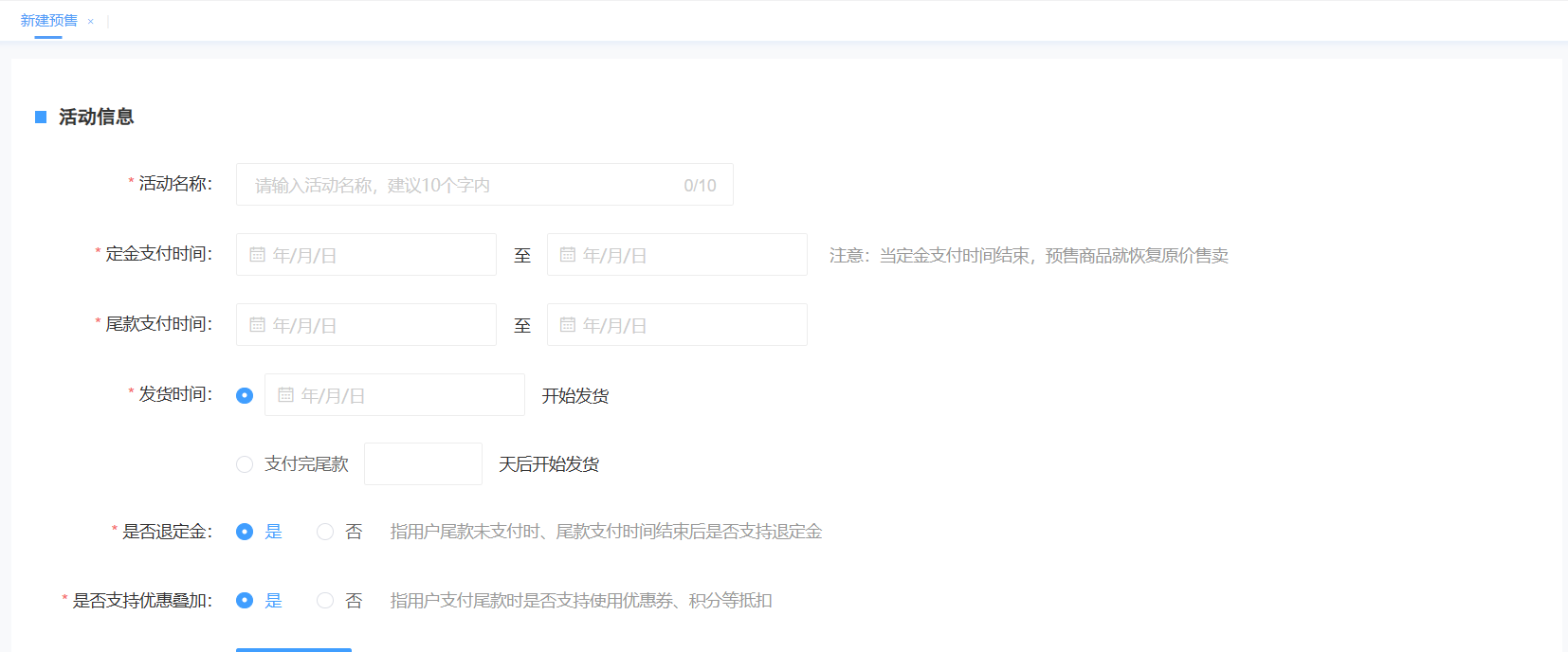 第二步:设置预售活动名称、预售定金支付时间、尾款支付时间和发货时间;