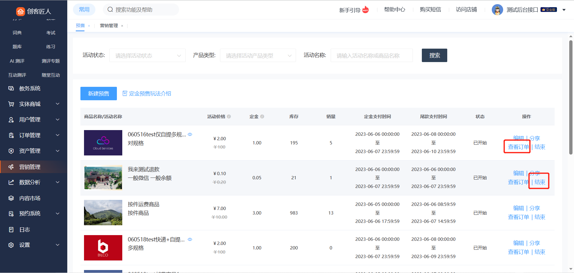 商家如果想提前结束活动,可以直接在活动列表找到对应的商品点击右侧的“结束”按钮,就可以结束该商品对应的预售活动了;