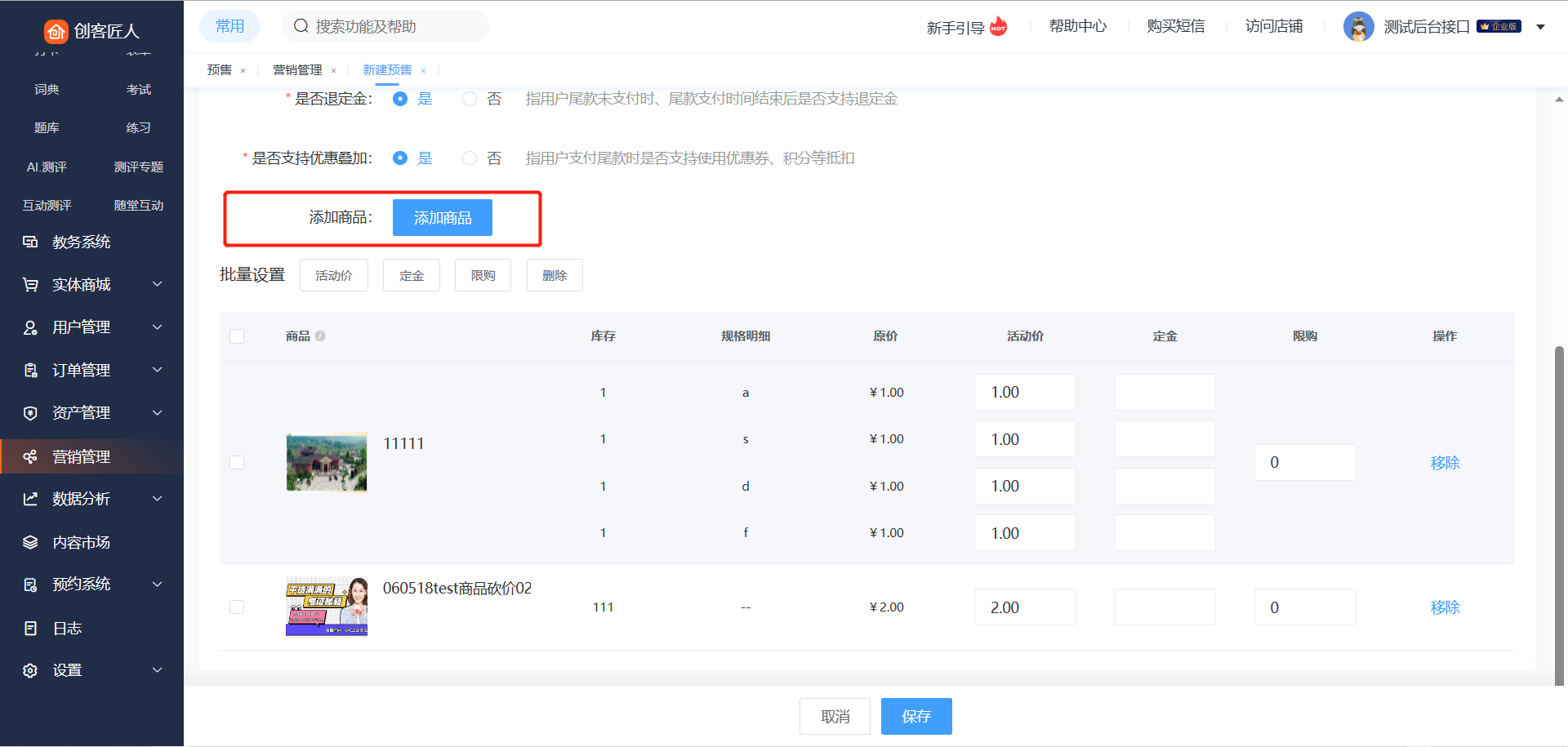 一个活动支持同时添加多个商品,多规格商品支持每个规格单独设置活动价和定金