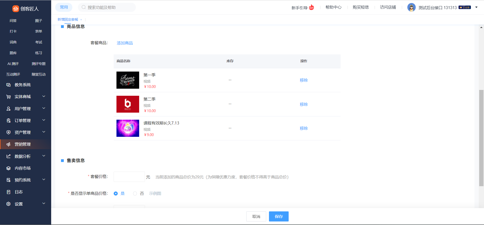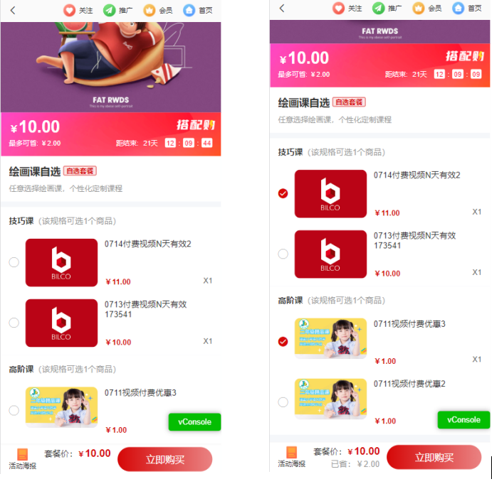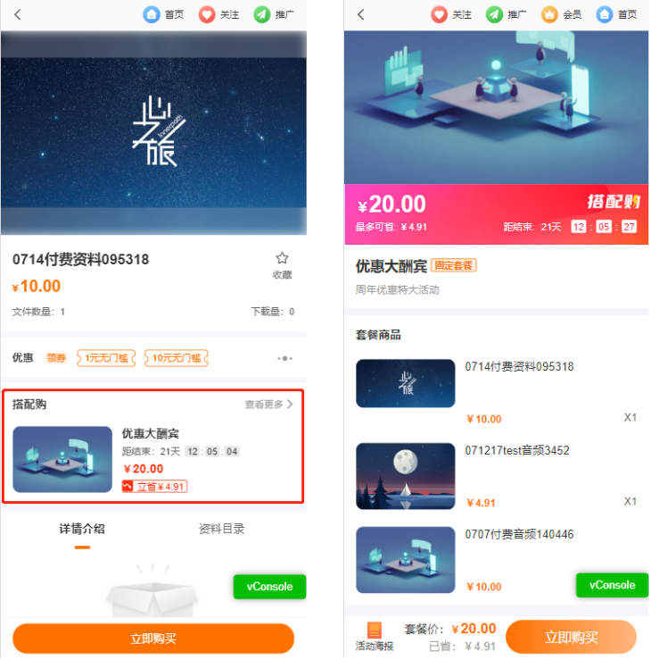场景2:老师B推出了一门新课程,但是并没有销量,于是将新老课程打包成固定套餐,以优惠套餐价出售,许多用户看到这个优惠力度后,不仅自己购买而且推广给好友,固定套餐将商品打包促销除了增加了商品的销量、提高了商品的曝光度,更引流了一批新学员。