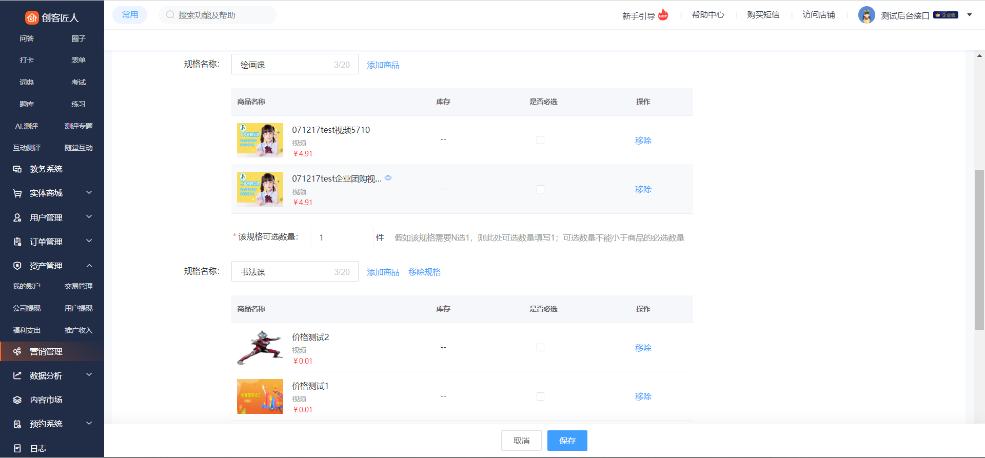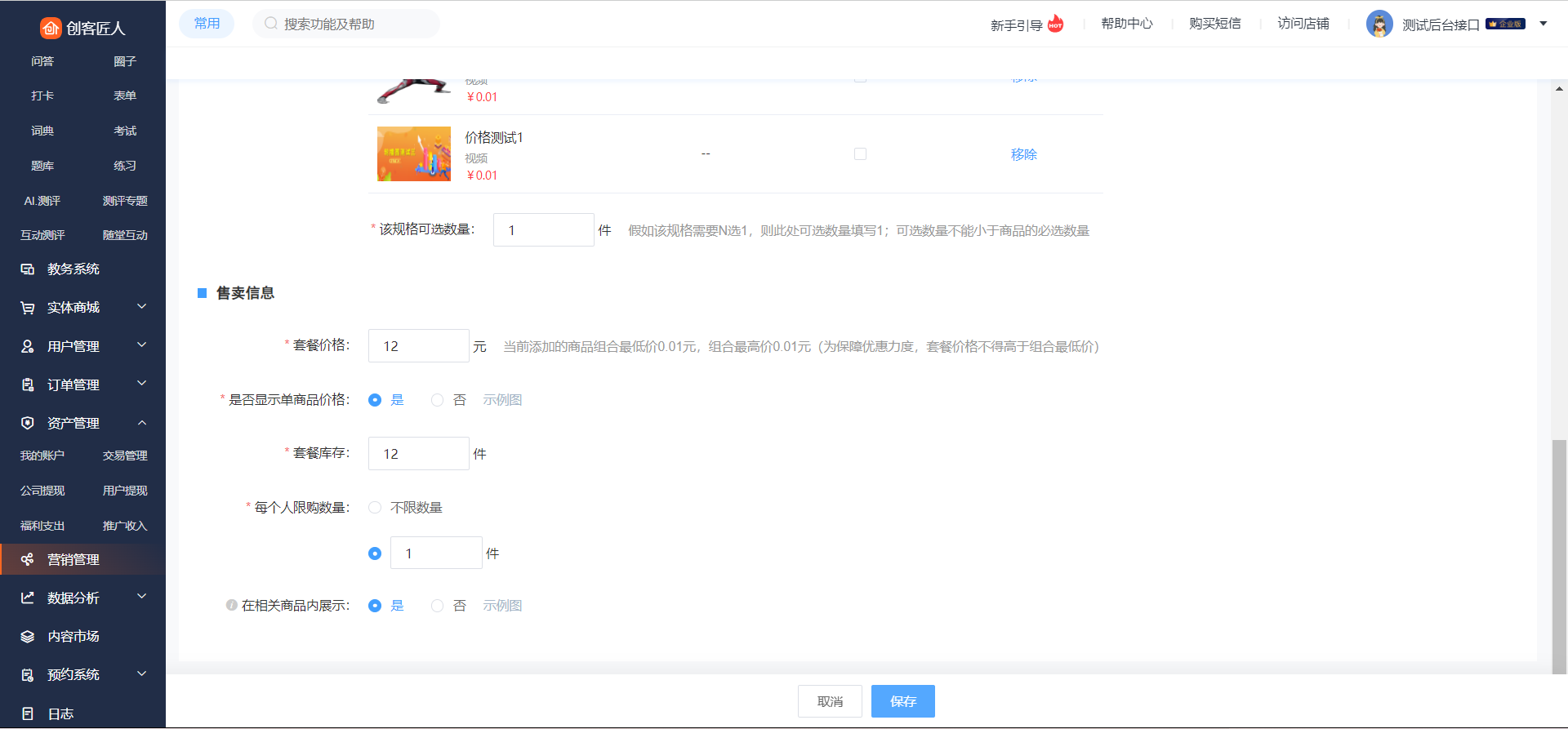 假设1:老师在第一个规格内添加了5个商品,设置可选数量为2件,则用户可在该规格内任意选择其中2件商品;