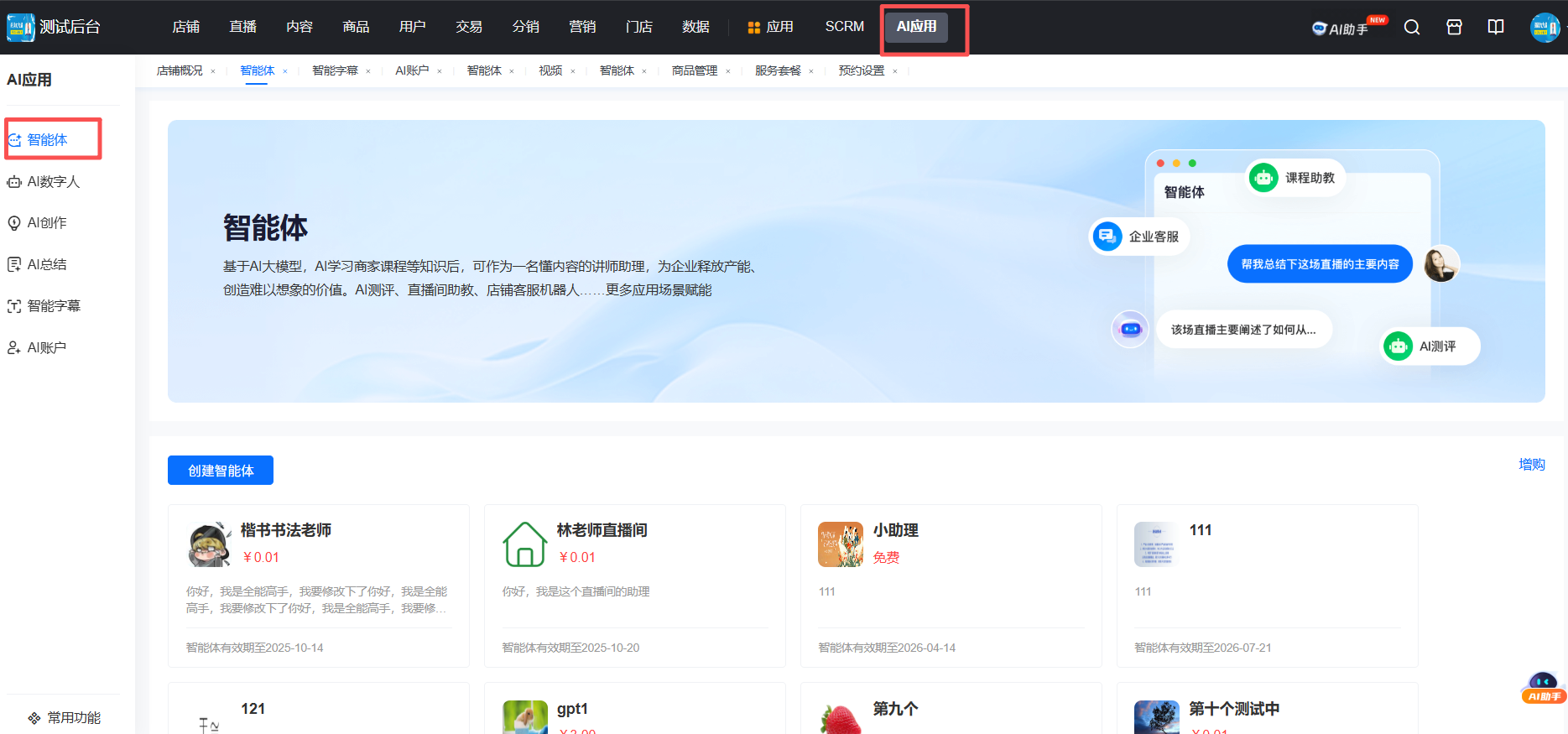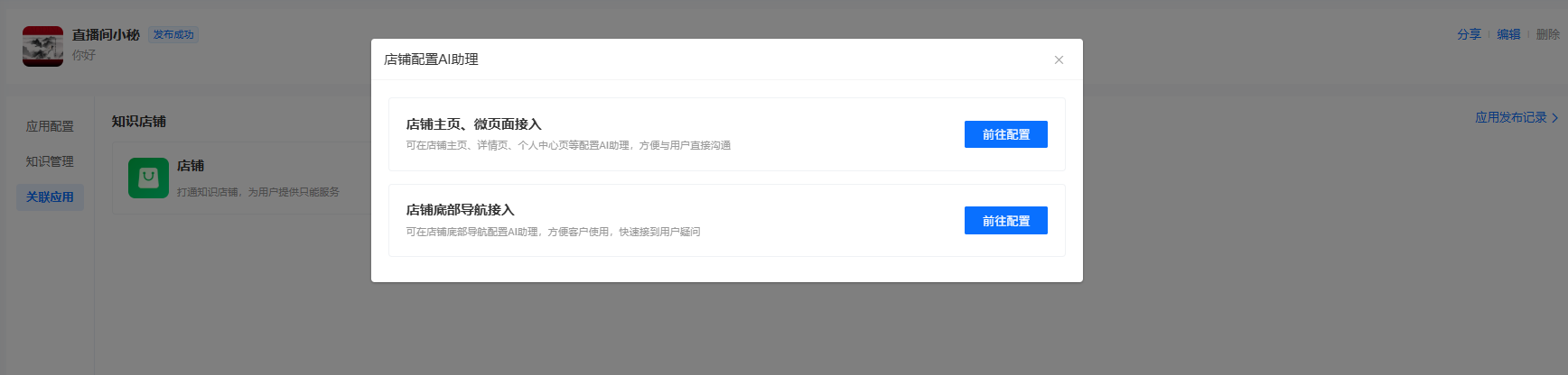最后需要把智能体关联到我们系统的不同场景,比如店铺,直播间等。
