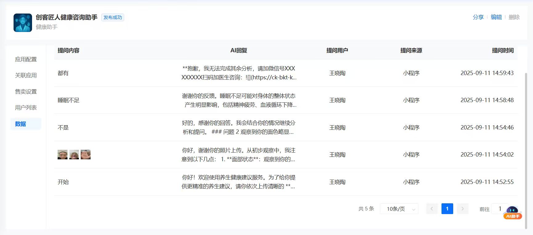可知道那个用户使用了该智能体,这个用户对话数据是什么