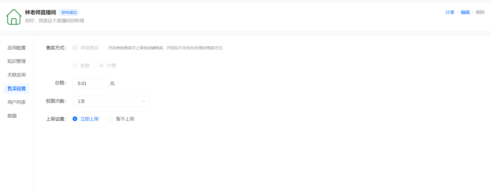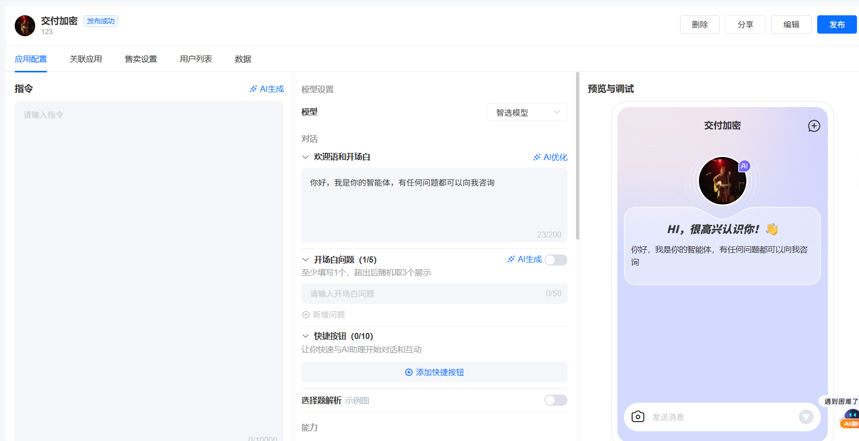 交付型的智能体可支持设置售卖设置,可设置免费和付费,比如支持测评3次9.9元。