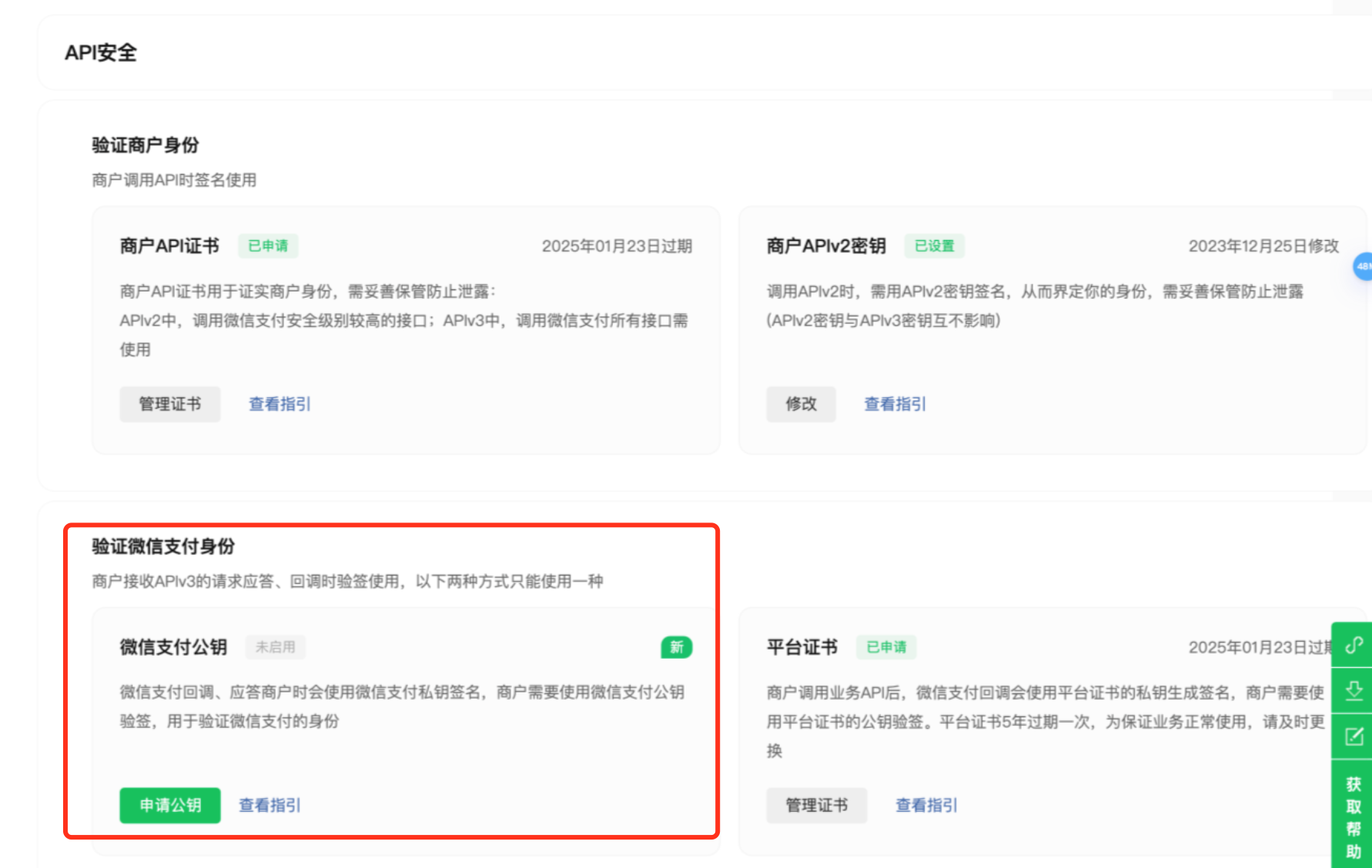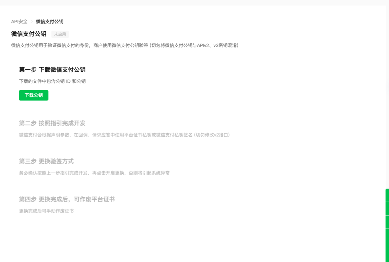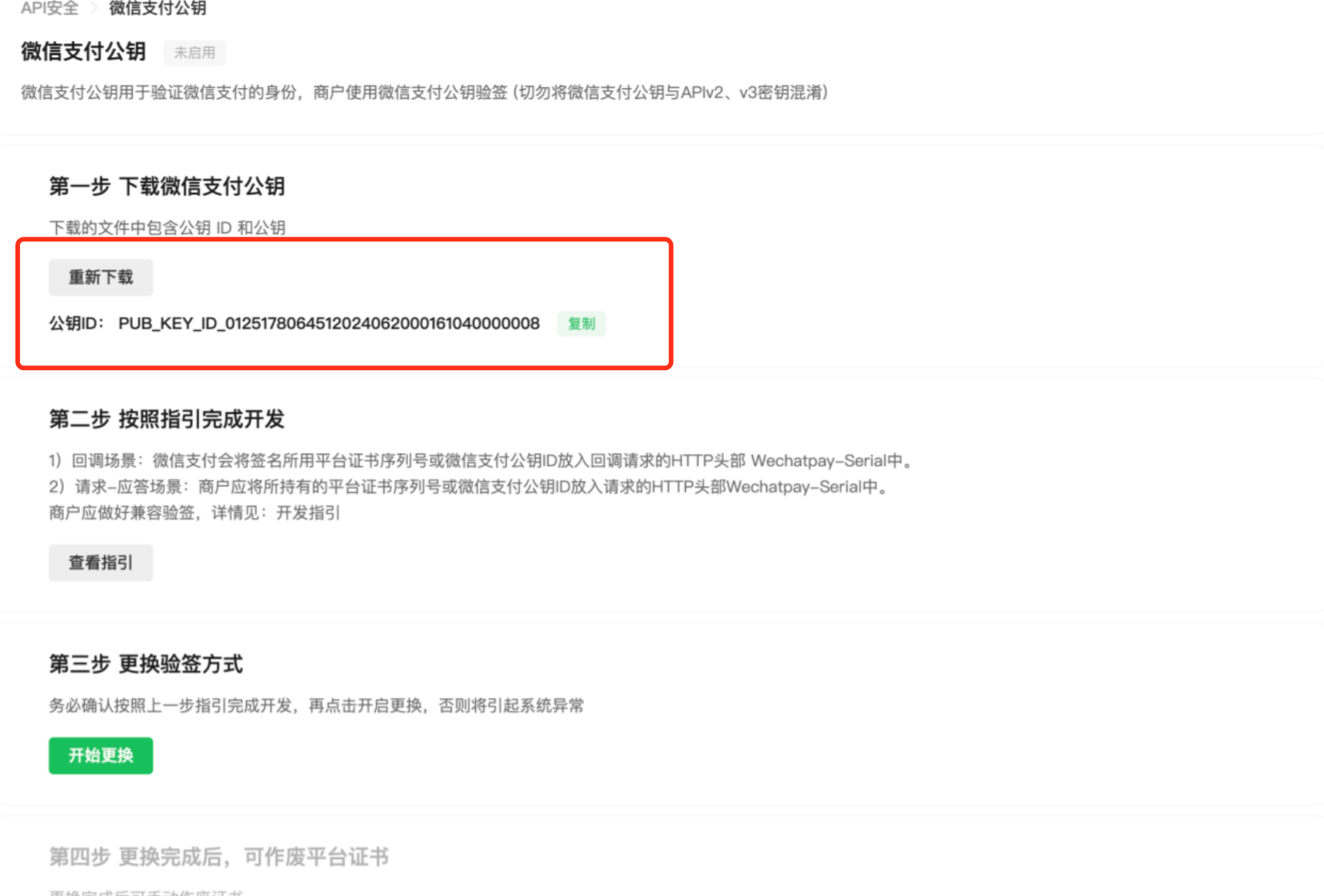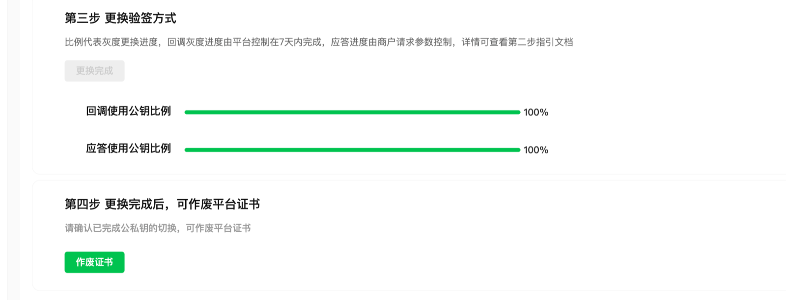 当你所有业务场景的请求已经携带了公钥ID,且经过7天回调灰度后,你可以在商户平台看到【回调使用公钥比例】和【应答使用公钥比例】都为100%,请确保业务已经覆盖完全,并且点击作废微信支付平台证书,至此变更完成。