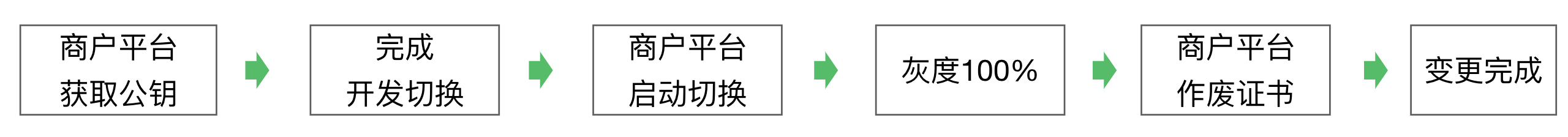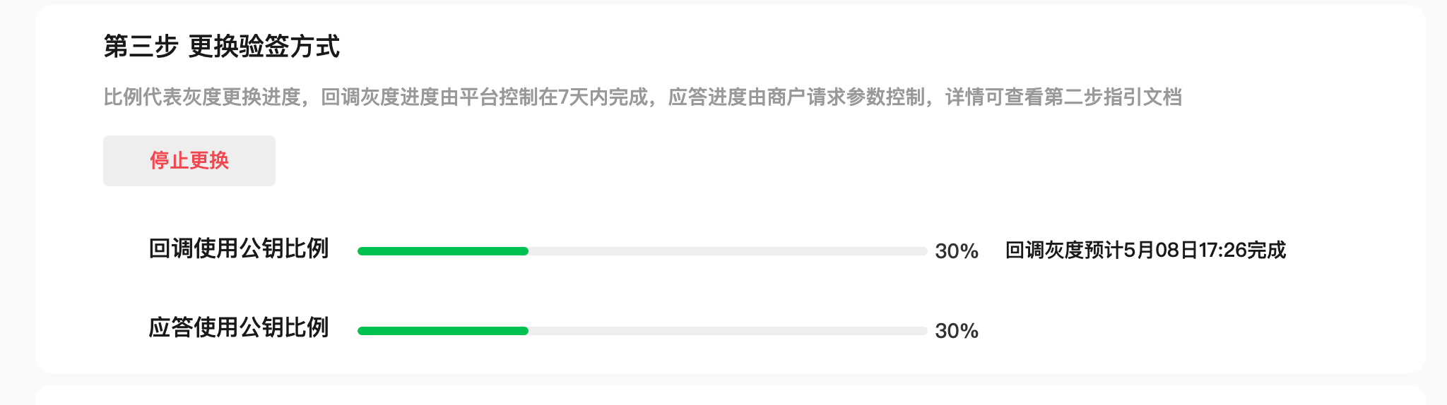 完成场景的开发之后,商户可以在商户平台点击“开始更换”,页面会区分回调、请求应答两个进度条分别展示切换进度;