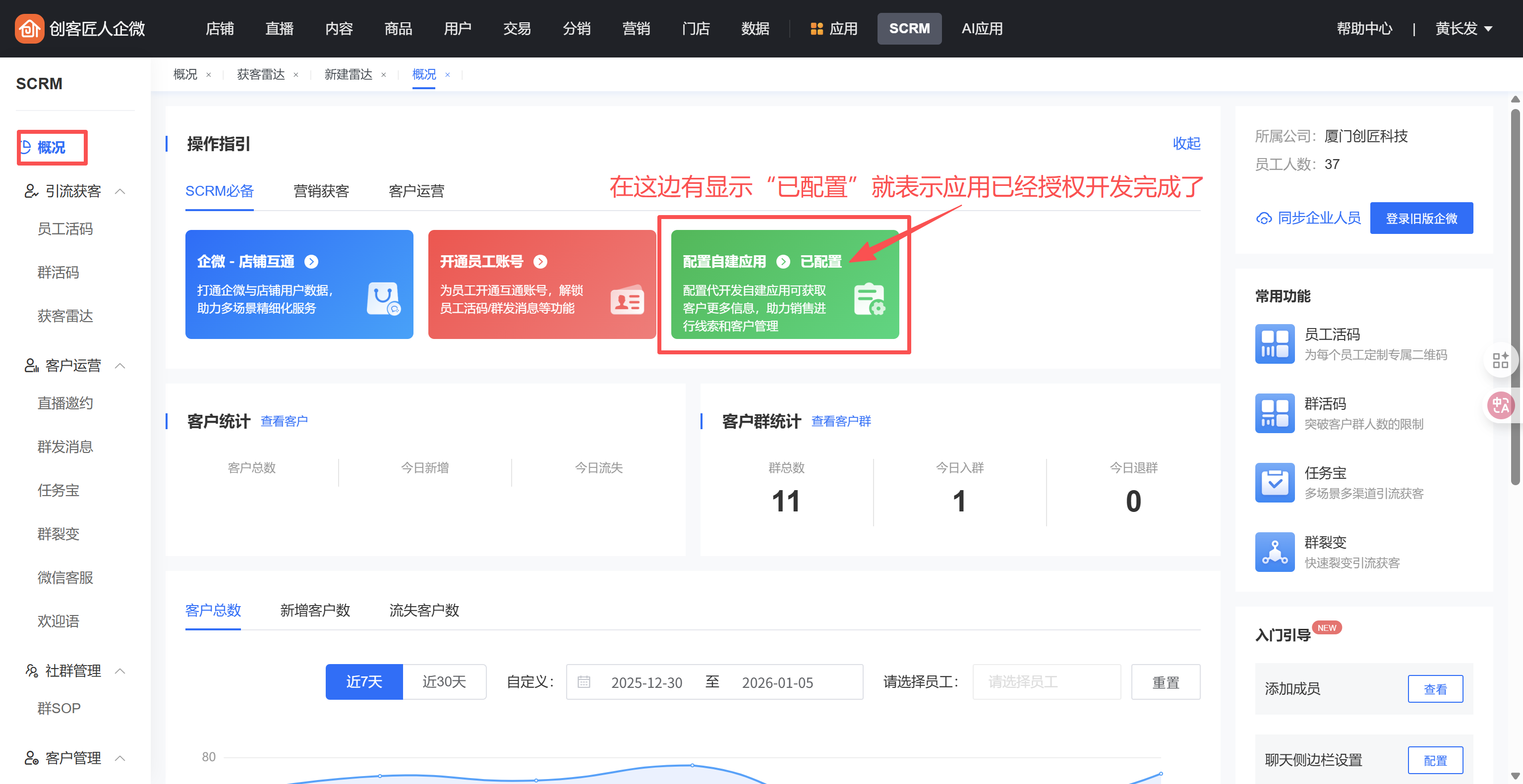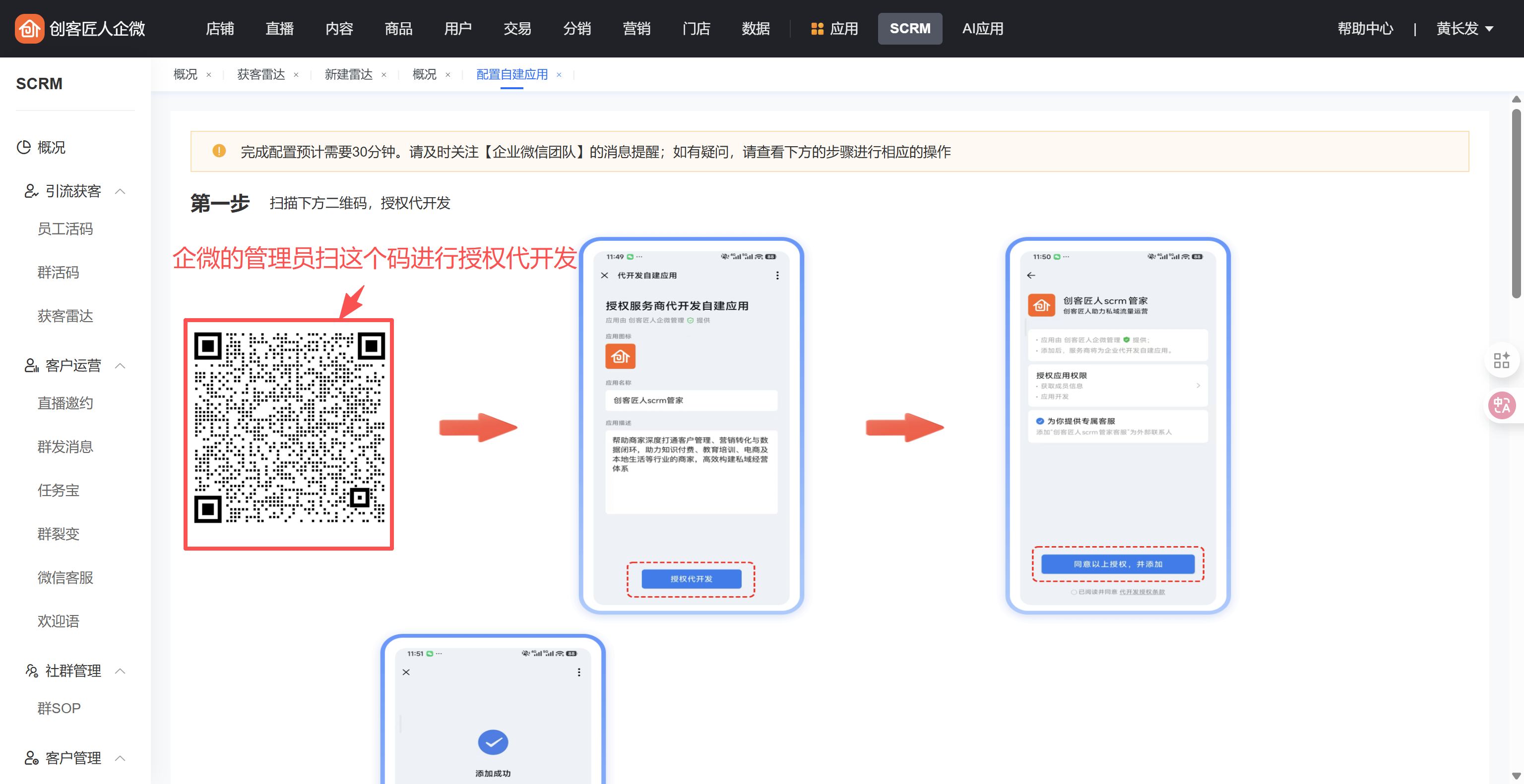 在SCRM的“概况-操作指引”点击“配置自建应用”,会有一个操作引导,可以跟着引导一步步授权
