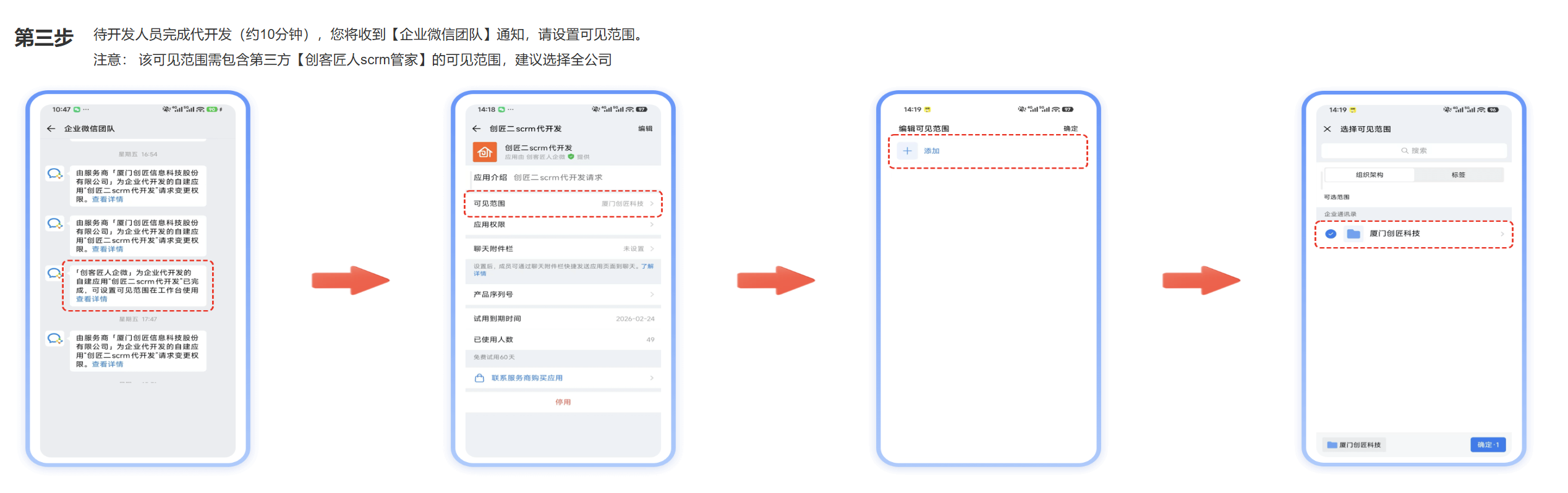 接着,企微服务团队会再发一条设置可见范围的通知,点击进去设置为全公司可见